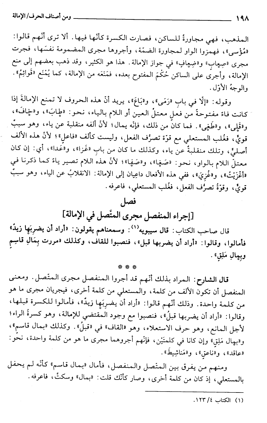 قال الشارح: المراد بذلك أنّهم قد أجروا المنفصل مجرى المتّصل. ومعنى المنفصل أن تكون الألف من كلمة، والمستعلي من كلمة أخرى، فيجريان مجرى ما هو من كلمة واحدة. وذلك أنّهم قالوا: "أراد أن يضرِبَها زيدٌ"، فأمالوا للكسرة قبلها، وقالوا: "أراد أن يضربها قبلُ"، فنصبوا مع وجود المْقتضي للإمالة، وهو كسرةُ الراء؛ لأجل المانع، وهو حرف الاستعلاء، وهو "القاف" في "قبلُ". وكذلك "بمال قاسمٍ"، و"بمال مَلِقٍ" وإن كانا في كلمتَيْن، فإنّهم أجروهما مجرى ما هو من كلمة واحدة، نحو: "عاقد"، و"ناعقٍ"، و"مَناشِيطَ".