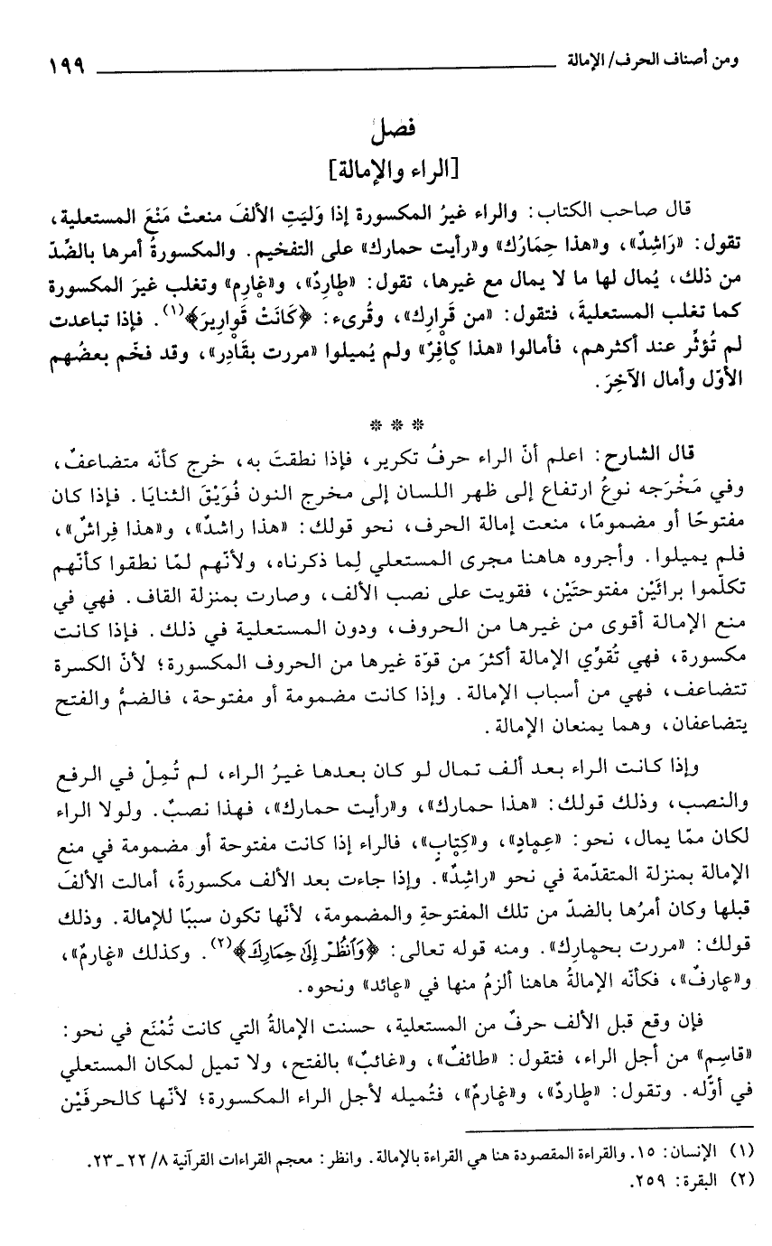 قال الشارح: اعلم أنّ الراء حرفُ تكرير، فإذا نطقتَ به، خرج كأنّه متضاعفٌ، وفي مَخْرَجه نوعُ ارتفاع إلى ظهر اللسان إلى مخرج النون فْوَيْقَ الثنايَا. فإذا كان مفتوحًا أو مضمومًا، منعت إمالة الحرف، نحو قولك: "هذا راشدٌ"، و"هذا فِراشٌ"، فلم يميلوا. وأجروه ها هنا مجرى المستعلى لِما ذكرناه، ولأنّهم لما نطقوا كأنّهم تكلّموا برائَيْن مفتوحتَيْن، فقويت على نصب الألف، وصارت بمنزلة القاف. فهي في منع الإمالة أقوى من غيرها من الحروف، ودون المستعلية في ذلك. فإذا كانت مكسورة، فهي تُقوِّي الإمالة أكثرَ من قوّة غيرها من الحروف المكسورة؛ لأنّ الكسرة تتضاعف، فهي من أسباب الإمالة. وإذا كانت مضمومة أو مفتوحة، فالضمُّ والفتح يتضاعفان، وهما يمنعان الإمالة.