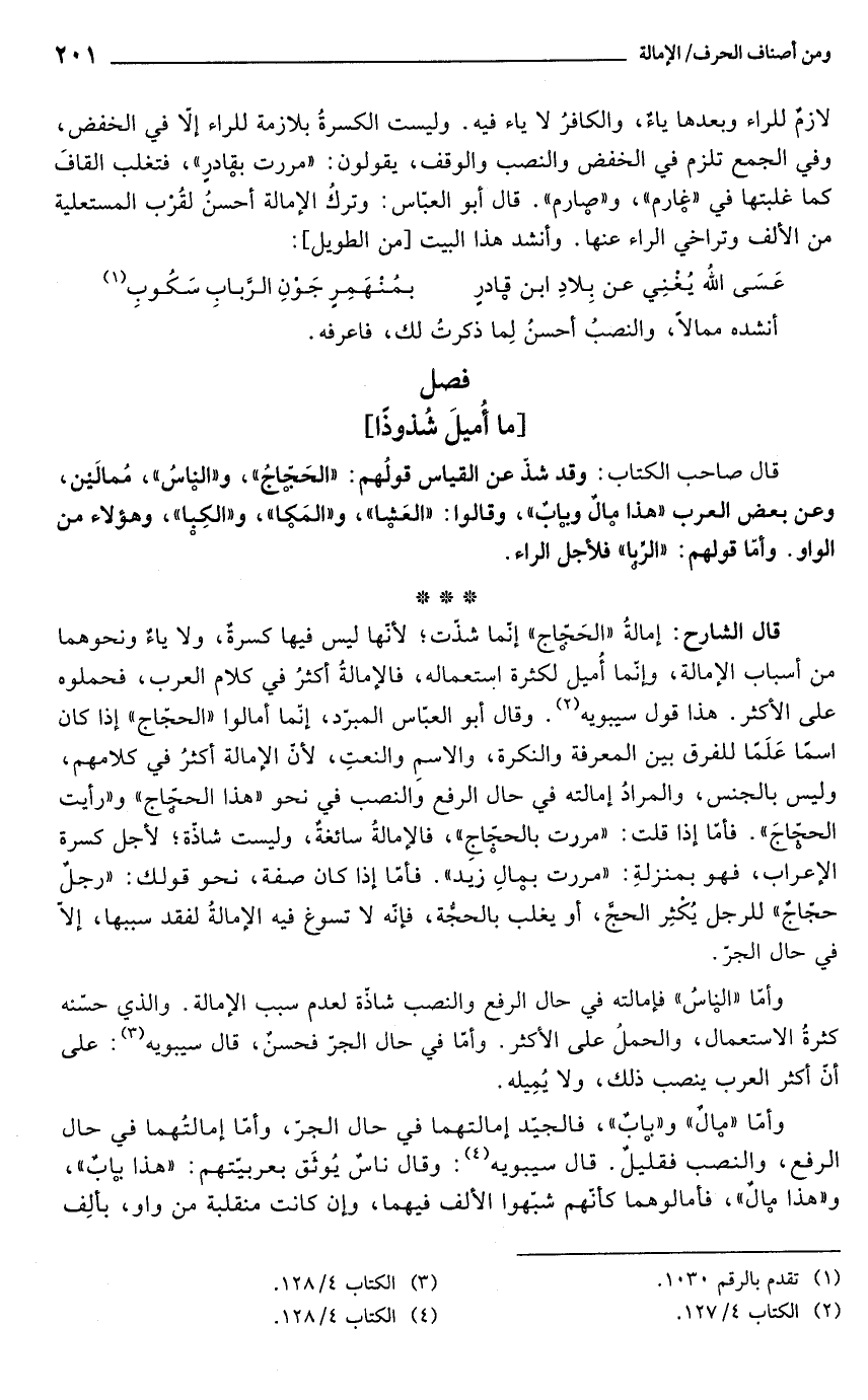 قال صاحب الكتاب: وقد شذ عن القياس قولهم الحجاج والناس ممالين, وعن بعض العرب "هذا مالٌ وبابٌ", وقالوا: "العشا", و"المكا" و"الكبا", وهؤلاء من الواو. وأما قولهم: "الرِّبا" فلأجل الراء.
