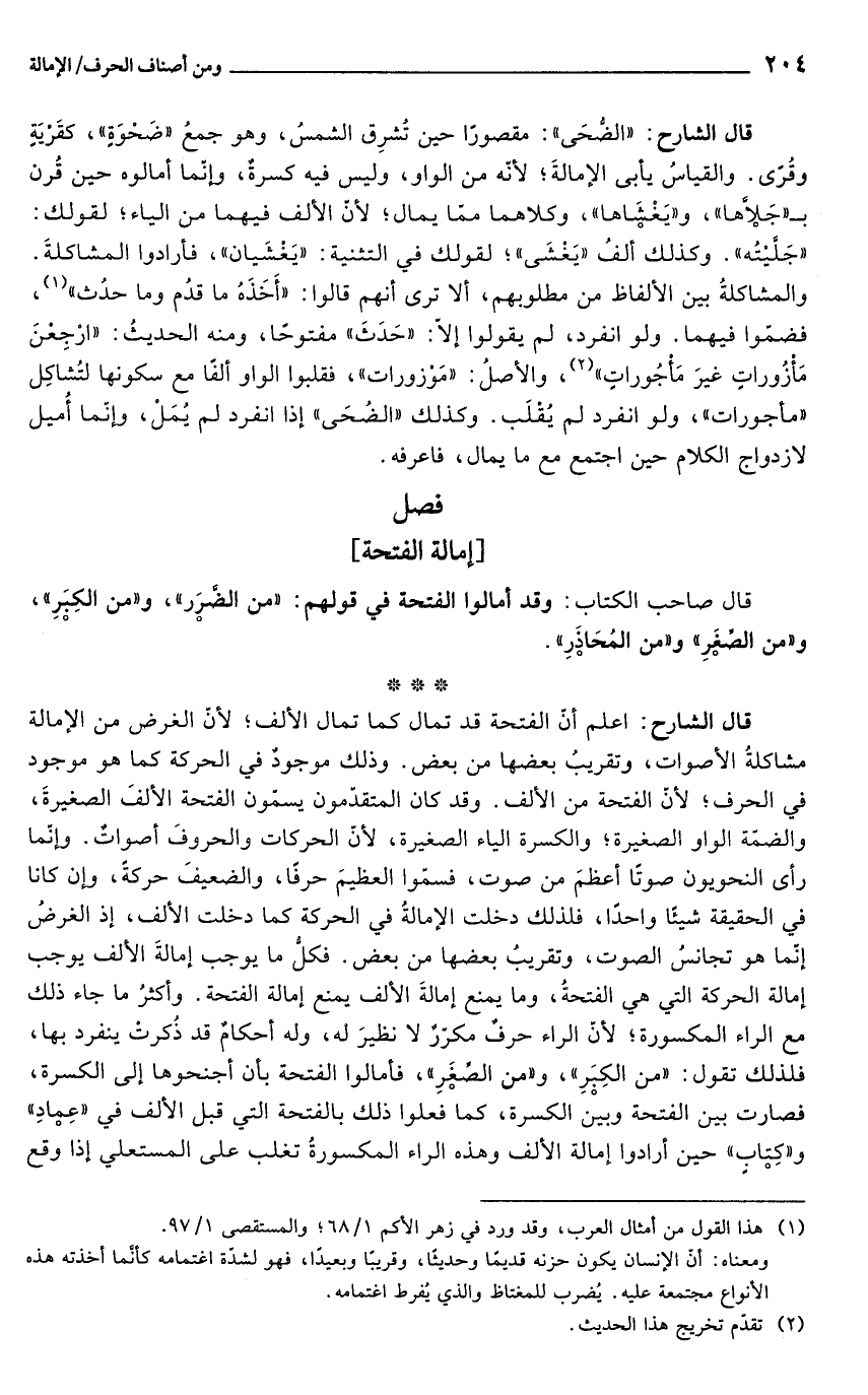 قال الشارح: "الضُّحَى": مقصورًا حين تُشرِق الشمسُ، وهو جمعُ "ضَحْوَةٍ"، كقَرْيَةٍ وقُرًى. والقياسُ يأبى الإمالةَ؛ لأنّه من الواو، وليس فيه كسرةٌ، وإنّما أمالوه حين قُرن بـ "جَلاَّها"، و"يَغْشَاها"، وكلاهما ممّا يمال؛ لأنّ الألف فيهما من الياء؛ لقولك: "جَلَّيْتُه". وكذلك ألفُ "يَغْشَى"؛ لقولك في التثنية: "يَغْشَيان"، فأرادوا المشاكلةَ. والمشاكلةُ بين الألفاظ من مطلوبهم، ألا ترى أنهم قالوا: "أَخَذَهُ ما قدُم وما حدُث" (¬1)، فضمّوا فيهما. ولو انفرد، لم يقولوا إلَّا: "حَدَثَ" مفتوحًا، ومنه الحديثُ: "ارْجِعْنَ مَأْزُوراتٍ غيرَ مَأْجُوراتٍ" (¬2)، والأصلُ: "مَوْزورات"، فقلبوا الواو ألفًا مع سكونها لتُشاكِل "مأجورات"، ولو انفرد لم يُقْلَب. وكذلك "الضُحَى" إذا انفرد لم يُمَلْ، وإنّما أُميل لازدواج الكلام حين اجتمع مع ما يمال، فاعرفه.