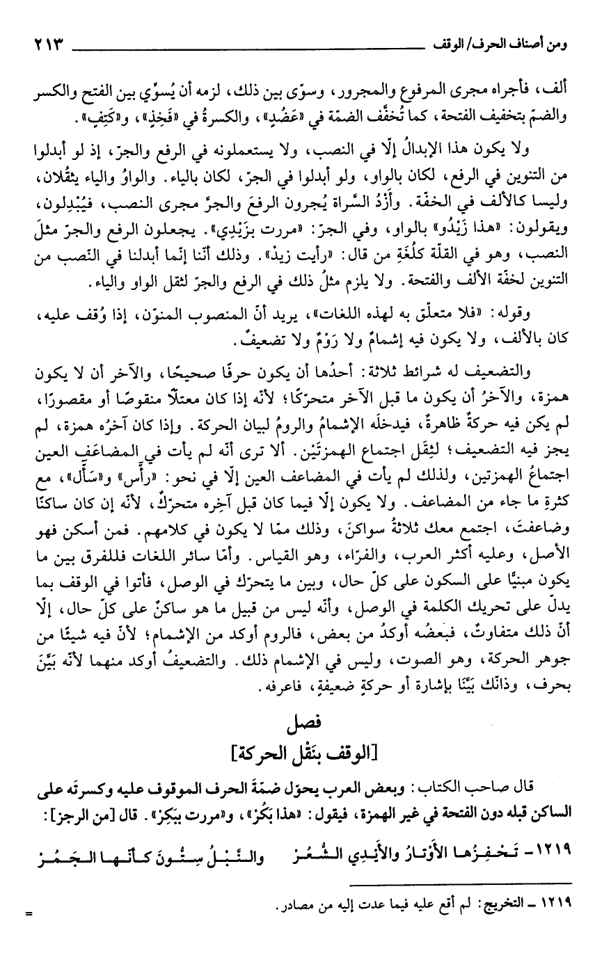 والتضعيف له شرائط ثلاثة: أحدُها أن يكون حرفًا صحيحًا، والآخر أن لا يكون همزة، والآخرُ أن يكون ما قبل الآخر متحرّكًا؛ لأنّه إذا كان معتلاً منقوصًا أو مقصورًا، لم يكن فيه حركةٌ ظاهرةٌ، فيدخلَه الإشمامُ والرومُ لبيان الحركة. وإذا كان آخرُه همزة، لم يجز فيه التضعيف؛ لثِقَل اجتماع الهمزتَيْن. ألا ترى أنّه لم يأت في المضاعَف العين اجتماعُ الهمزتين، ولذلك لم يأت في المضاعف العين إلَّا في نحو: "رأس" و"سَأل"، مع كثرةِ ما جاء من المضاعف. ولا يكونْ إلَّا فيما كان قبل آخِره متحرّكٌ, لأنّه إن كان ساكنًا وضاعفتَ، اجتمع معك ثلاثةُ سواكنَ، وذلك ممّا لا يكون في كلامهم. فمن أسكن فهو الأصل، وعليه أكثر العرب، والفرّاء، وهو القياس. وأمّا سائر اللغات فللفرق بين ما يكون مبنيًّا على السكون على كلّ حال، وبين ما يتحرّك في الوصل، فأتوا في الوقف بما يدلّ على تحريك الكلمة في الوصل، وأنّه ليس من قبيل ما هو ساكنٌ على كلّ حال، إلَّا أنّ ذلك متفاوتٌ، فبعضُه أوكدُ من بعض، فالروم أوكد من الإشمام؛ لأنّ فيه شيئًا من جوهر الحركة، وهو الصوت، وليس في الإشمام ذلك. والتضعيفُ أوكد منهما لأنّه بَيَّنَ بحرف، وذانّك بَيَّنَا بإشارة أو حركةٍ ضعيفةٍ، فاعرفه.