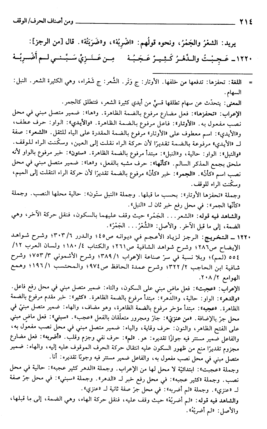الإعراب: "عجبت": فعل ماضٍ مبني على السكون، والتاء: ضمير متصل مبنى في محل رفع فاعل. "والدهر": الواو: حالية، و"الدهر": مبتدأ مرفوع بالضمة الظاهرة. "كثير": خبر مقدم مرفوع بالضمة الظاهرة. "عجبه": مبتدأ مؤخر مرفوع بالضمة الظاهرة، وهو مضاف، والهاء: ضمير متصل مبنيّ في محل جرّ بالإضافة. "من عنزيّ": جارّ ومجرور متعلّقان بالفعل "عجب". "سبني": فعل ماضٍ مبني على الفتح الظاهر، والنون: حرف وقاية، والياء: ضمير متصل مبني في محل نصب مفعول به، والفاعل ضمير مستتر فيه جوازًا تقديره: هو. "لم": حرف نفي وجزم وقلب. "أضربه": فعل مضارع مجزوم تقديرًا منع من ظهور السكون عليه انتقال حركة الحرف الموقوف عليه إليه، والهاء: ضمير متصل مبني في محل نصب مفعول به، والفاعل ضمير مستتر فيه وجوبًا تقديره: أنا.