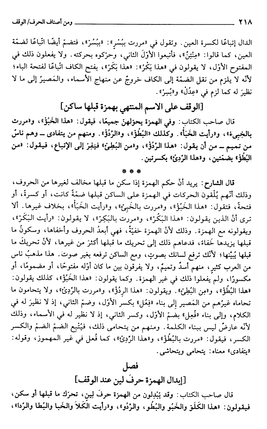 قال الشارح: يريد أنّ حكم الهمزة إذا سكن ما قبلها مخالف لغيرها من الحروف، وذلك أنّهم يُلْقون الحركات في الهمزة على الساكن قبلها ضمّةً كانت، أو كسرةً، أو فتحةً، فتقول: "هذا الخَبُؤْ"، و"مررت بالخَبِئْ"، و"رأيت الخَبَأْ"، بخلاف غيرها. ألا ترى أنّ الذين يقولون: "هذا البَكُرْ"، و"مررت بالبَكِرْ"، لا يقولون: "رأيت البَكَرْ"، ويقولونه مع الهمزة. وذلك لأنّ الهمزة خفيّةٌ، فهي أبعدُ الحروف وأخفاها، وسكونُ ما قبلها يزيدها خَفاءً، فدعاهم ذلك إلى تحريك ما قبلها أكثرَ من غيرها, لأنّ تحريكَ ما قبلها يُبيِّنها؛ لأنّك ترفع لسانك بصوتٍ، ومع الساكن ترفعه بغير صوت. هذا مذهبُ ناس من العرب كثيرٍ، منهم أسدٌ وتميمٌ، ولا يفرقون بين ما كان أوّله مفتوحًا، أو مضمومًا، أو مكسورًا, ولم يفعلوا ذلك في غير الهمزة. وكما يقولون: "هذا الخَبُؤْ"، كذلك يقولون: "هذا البُطُؤْ"، و"مِن البُطِىْء"، ويقولون: "هذا الرِدُؤْ"، و"مررت بالرِّدِىْء"، ولا يتحامون ما تحاماه غيرُهم من المَصير إِلى بناء "فِعُل" بكسر الأوّل، وضمّ الثاني، إذ لا نظيرَ له في الكلام، وإلى بناء "فُعِل" بضمّ الأوّل، وكسر الثاني، إذ لا نظير له في الأسماء، وذلك لأنّه عارضٌ ليس ببناء الكلمة. ومنهم من يتحامى ذلك، فيُتْبع الضمّ الضمّ والكسر الكسر، فيقول: "مررت بالبُطُؤْ"، و"هذا الرِّدِىْء"، كما فُعل في غير المهموز، وقوله: "يتفادى" معناه: يتحامى ويتحاشى.