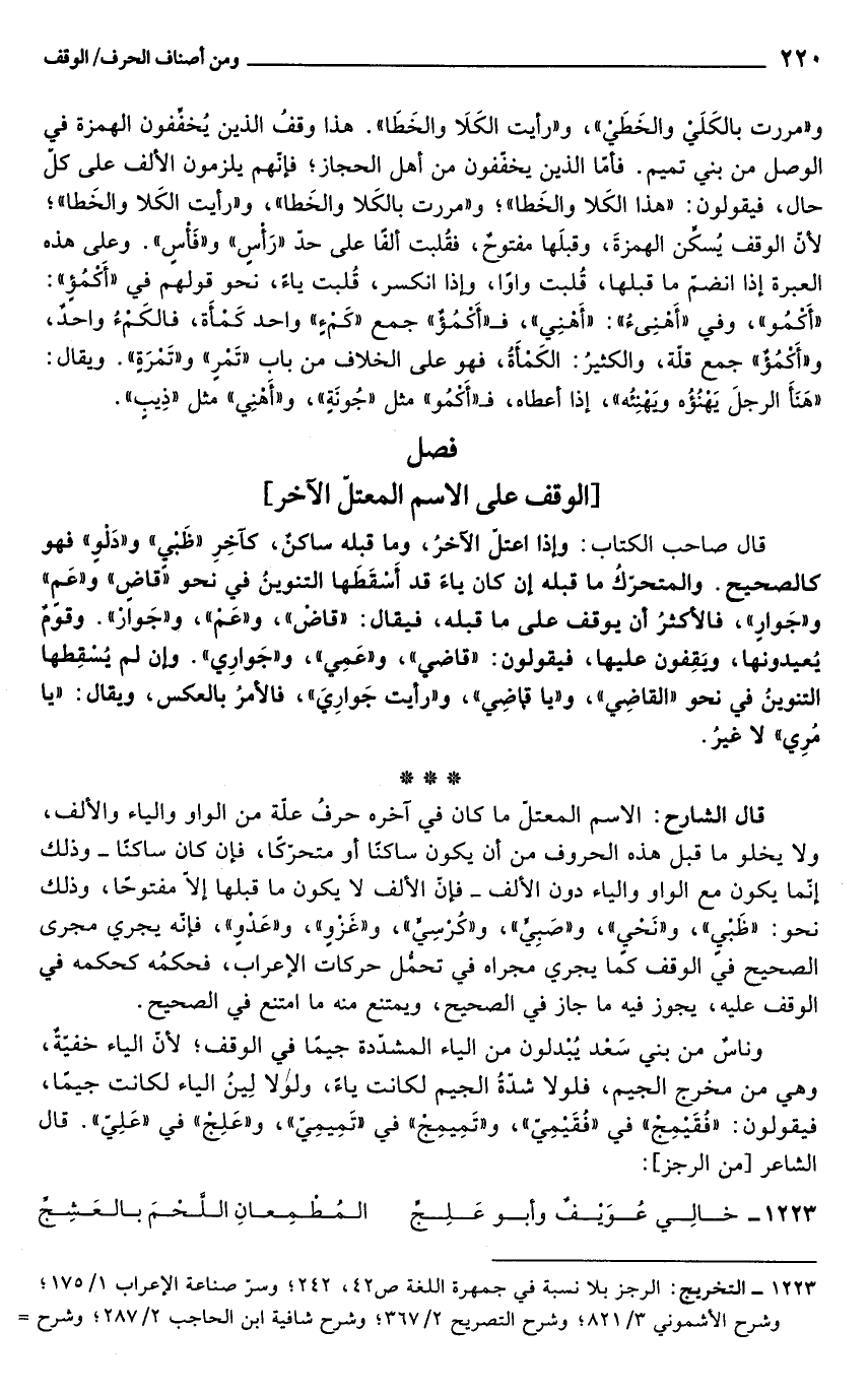 قال صاحب الكتاب: وإذا اعتل الآخر, وما قبله ساكنٌ, كآخر "ظبي" و"دلو" فهو كالصحيح. والمتحرك ما قبله إن كان ياء قد أسقطها التنوين في نحو "قاضٍ" و"عم" و"جوارٍ" فالأكثر أن يوقف على ما قبله فيقال: "قاض", و"عم" و"جوار". وقوم يعيدونها ويقفون عليها فيقولون: "قاضي" و"عمي" و"جواري". وإن لم يسقطها التنوين في نحو "القاضي" و"يا قاضي" و"رأيت جواري", فالأمر بالعكس، ويقال "يا مري" لا غير.