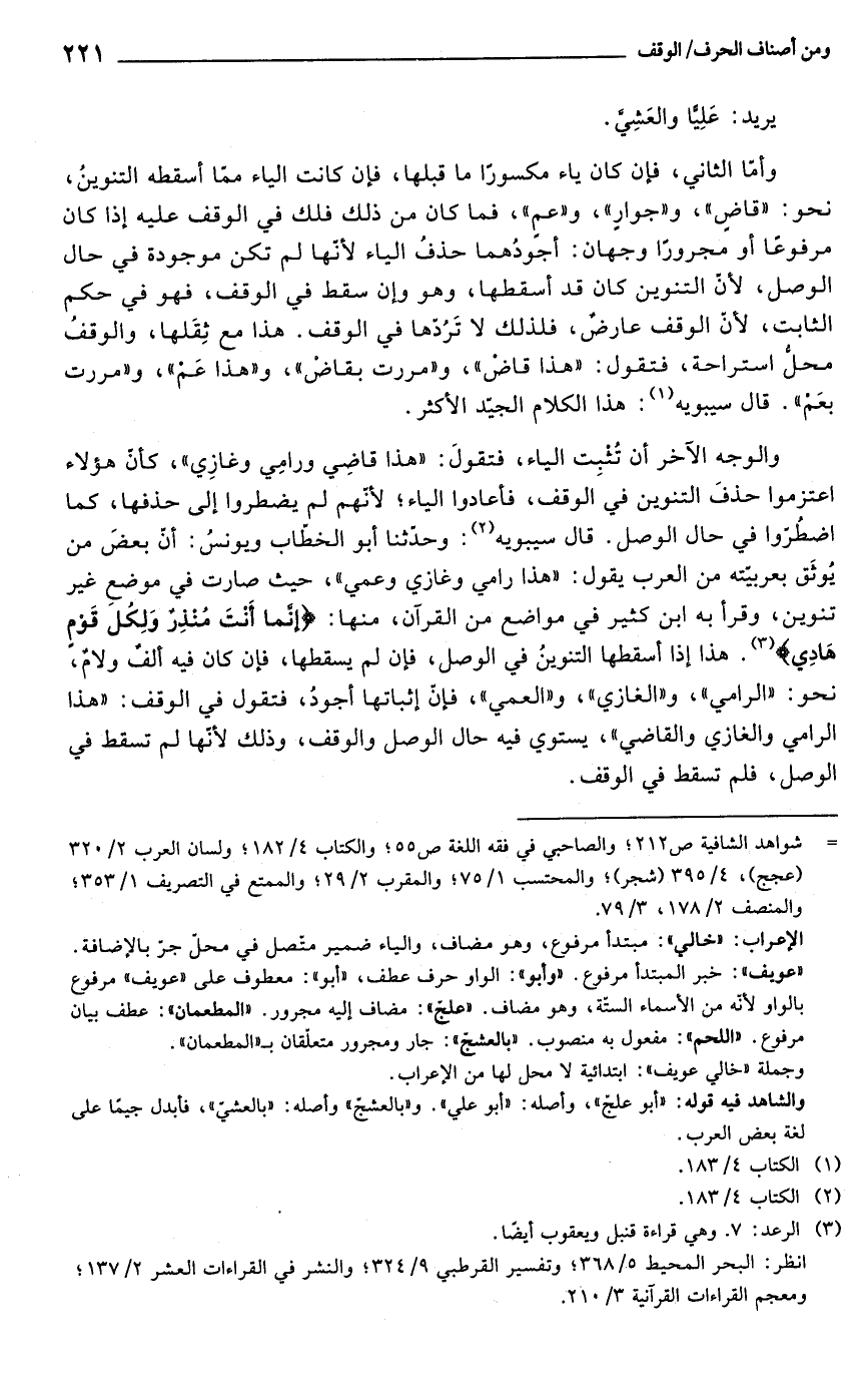 والوجه الآخر أن تُثْبِت الياء، فتقولَ: "هذا قاضِى ورامِي وغازِي"، كأنّ هؤلاء اعتزموا حذفَ التنوين في الوقف، فأعادوا الياء؛ لأنّهم لم يضطروا إلى حذفها، كما اضطُرّوا في حال الوصل. قال سيبويه (¬2): وحدّثنا أبو الخطّاب ويونسُ: أنّ بعضَ من يُوثَق بعربيّته من العرب يقول: "هذا رامي وغازي وعمي"، حيث صارت في موضعِ غير تنوين، وقرأ به ابن كثير في مواضع من القرآن، منها: {إِنَّمَا أَنْتَ مُنْذِرٌ وَلِكُلِّ قَوْمٍ هَادٍ} (¬3). هذا إذا أسقطها التنوينُ في الوصل، فإن لم يسقطها، فإن كان فيه ألفٌ ولامٌ، نحو: "الرامي"، و"الغازي"، و"العمي"، فإنّ إثباتها أجودُ، فتقول في الوقف: "هذا الرامي والغازي والقاضي"، يستوي فيه حال الوصل والوقف، وذلك لأنّها لم تسقط في الوصل، فلم تسقط في الوقف.