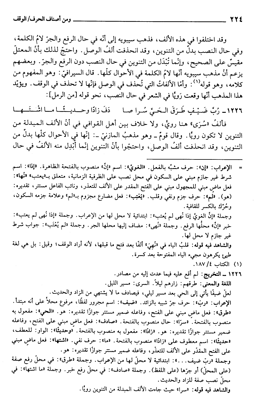 فألفُ "سُرَى" هنا رويٌّ، ولا خلاف بين أهل القوافي في أنّ الألف المبدلة من التنوين لا تكون رويًّا. وقال قومٌ - وهو مذهبُ المازنيّ -: إنّها في الأحوال كلّها بدلٌ من التنوين، وقد انحذفت ألفُ الوصل، واحتجّوا بأنّ التنوين إنّما أُبْدِل منه الألفُ في حال