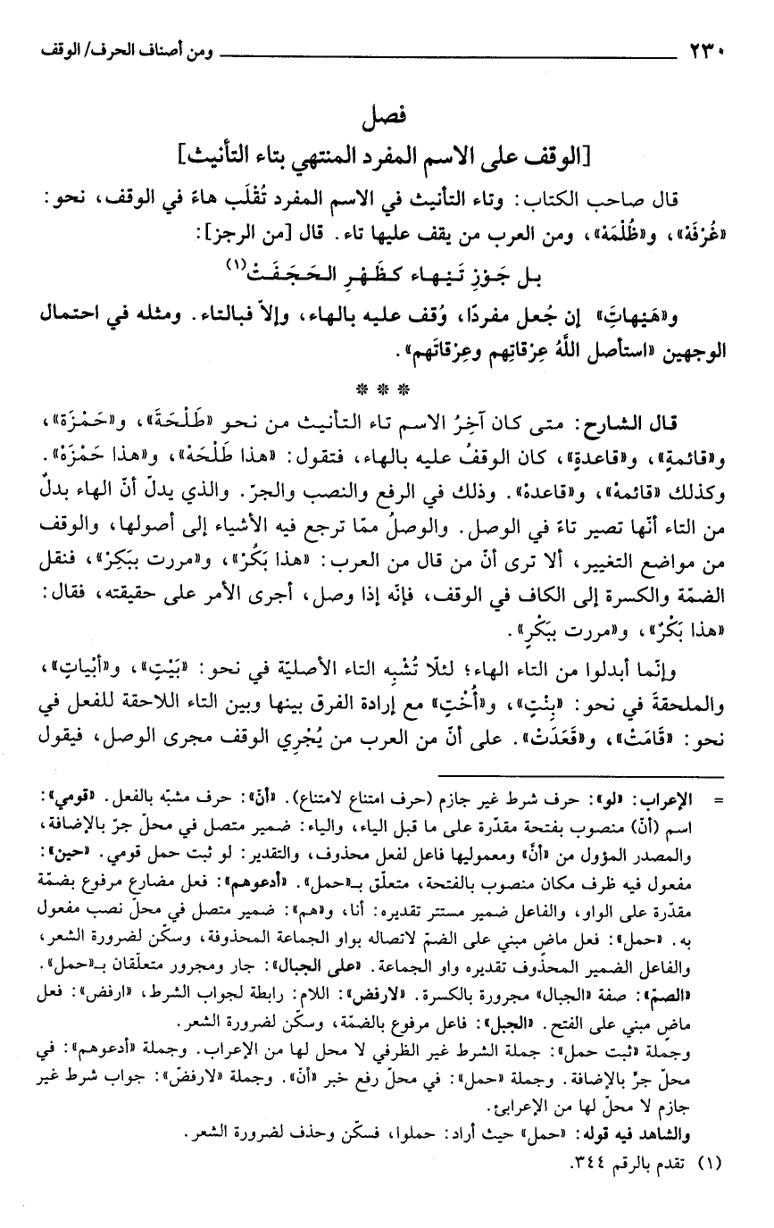 قال الشارح: متى كان آخِرُ الاسم تاء التأنيث من نحو "طَلْحَةَ"، و"حَمْزَة"، و"قائمةٍ"، و"قاعدةٍ"، كان الوقفُ عليه بالهاء، فتقول: "هذا طَلْحَهْ"، و"هذا حَمْزَهْ". وكذلك "قائمهْ"، و"قاعدهْ". وذلك في الرفع والنصب والجرّ. والذي يدلّ أنّ الهاء بدلٌ من التاء أنّها تصير تاءً في الوصل. والوصلُ ممّا ترجع فيه الأشياء إلى أصولها، والوقف من مواضع التغيير، ألا ترى أنّ من قال من العرب: "هذا بَكُرْ"، و"مررت ببَكِرْ"، فنقل الضمّة والكسرة إلى الكاف في الوقف، فإنّه إذا وصل، أجرى الأمر على حقيقته، فقال: "هذا بَكْرٌ"، و"مررت ببَكْرٍ".