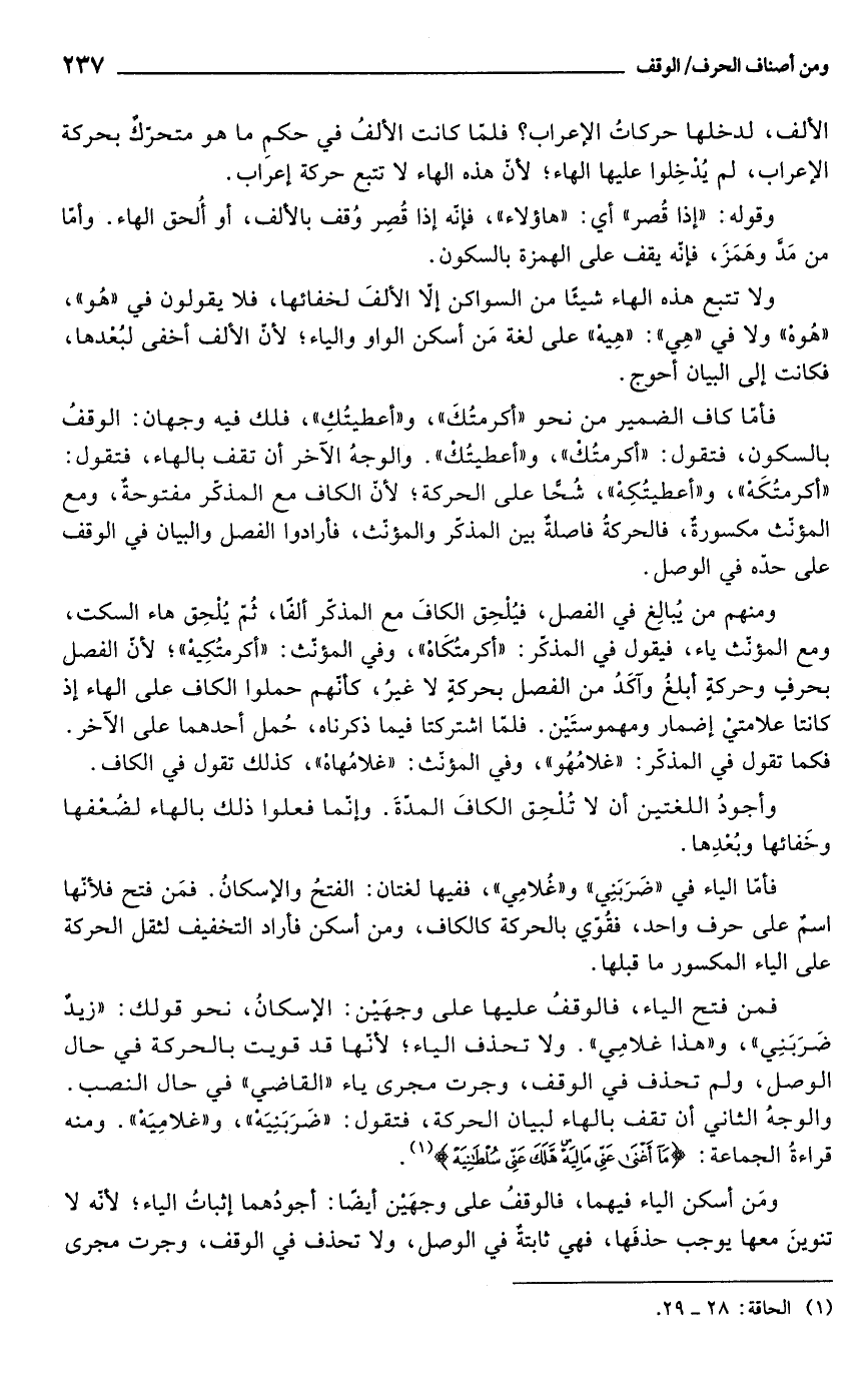 فأمّا كاف الضمير من نحو "أكرمتُكَ"، و"أعطيتُكِ"، فلك فيه وجهان: الوقفُ بالسكون، فتقول: "أكرمتُكْ"، و"أعطيتُكْ". والوجهُ الآخر أنّ تقف بالهاء، فتقول: "أكرمتُكَهْ"، و"أعطيتُكِهْ"، شُحًّا على الحركة؛ لأنّ الكاف مع المذكّر مفتوحةٌ، ومع المؤنّث مكسورةٌ، فالحركةُ فاصلةٌ بين المذكر والمؤنّث، فأرادوا الفصل والبيان في الوقف على حدّه في الوصل.