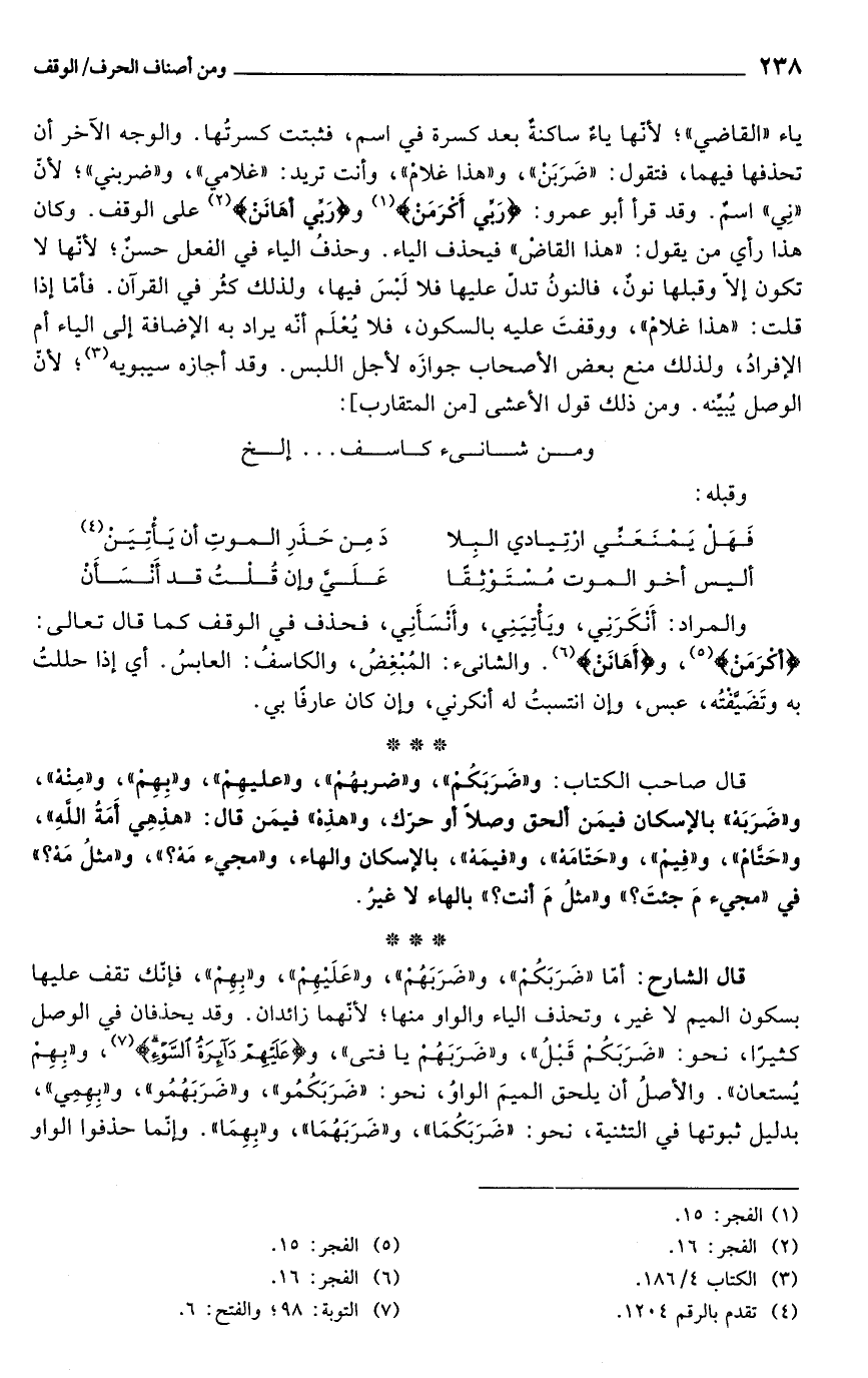 ياء "القاضي"؛ لأنّها ياءٌ ساكنةٌ بعد كسرة في اسم، فثبتت كسرتُها. والوجه الآخر أن تحذفها فيهما، فتقول: "ضَرَبَنْ"، و"هذا غلامْ"، وأنت تريد: "غلامي"، و"ضربني"؛ لأنّ "نِي" اسمٌ. وقد قرأ أبو عمرو: {رَبِّي أَكْرَمَنْ} (¬1) و {رَبِّي أَهَانَنْ} (¬2) على الوقف. وكان هذا رأي من يقول: "هذا القاضْ" فيحذف الياء. وحذفُ الياء في الفعل حسنٌ؛ لأنّها لا تكون إلّا وقبلها نونٌ، فالنونُ تدل عليها فلا لَبْسَ فيها, ولذلك كثُر في القرآن. فأمّا إذا قلت: "هذا غلامْ"، ووقفتَ عليه بالسكون، فلا يُعْلَم أنّه يراد به الإضافة إلى الياء أم الإفرادُ، ولذلك منع بعض الأصحاب جوازَه لأجل اللبس. وقد أجازه سيبويه (¬3)؛ لأنّ الوصل يُبيِّنه. ومن ذلك قول الأعشى [من المتقارب]: