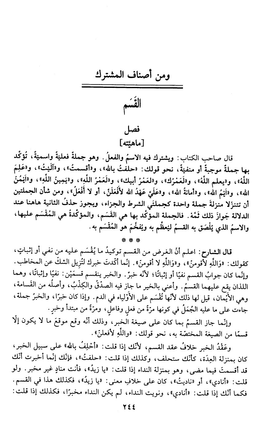 قال الشارح: اعلم أنّ الغرض من القسم توكيدُ ما يُقْسَم عليه من نفي أو إثباتٍ، كقولك: "وَاللَّهِ لأقومنّ"، و"وَاللَّهِ لا أقومنّ". إنّما أكّدتَ خبرك لتُزِيل الشكّ عن المخاطب. وإنّما كان جوابُ القسم نفيًا أو إثباتًا؛ لأنّه خبرٌ. والخبر ينقسم قسمَيْن: نفيًا وإثباتًا، وهما اللذان يقع عليهما القسمُ. وأعني بالخير ما جاز فيه الصدْقُ والكِذْبُ، وأصلُه من القَسامة، وهي الأَيْمان، قيل لها ذلك لأنّها تُقْسَم على الأَوْلياء في الدم. وإذا كان خبرًا، والخبرُ جملة، جاءت على ما عليه الجُمَلُ في كونها مرّةً من فعلٍ وفاعلٍ، ومرّةً من مبتدأ وخبرٍ.