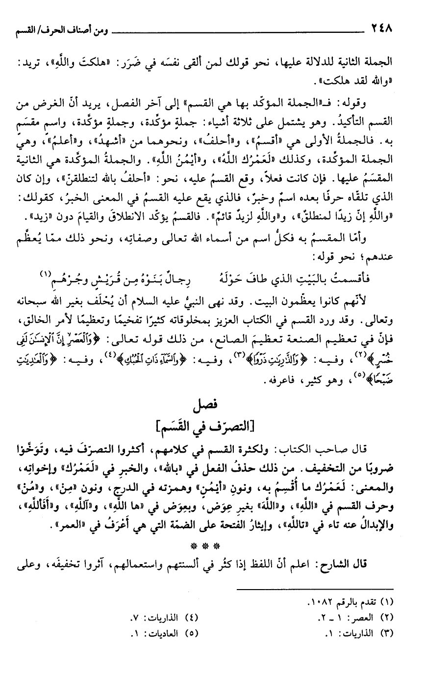 قال صاحب الكتاب: ولكثرة القسم في كلامهم أكثروا التصرف فيه، وتوخوا ضروباً من التخفيف. من ذلك حذف الفعل في "بالله"، والخبر في لعمرك وأخواته، والمعنى: لعمرك ما أقسم به، ونون أيمن وهمزته في الدرج، ونون "مِنْ" و"مُنْ" وحرف القسم في "اللهِ", و"اللهَ" بغير عوض، وبعوض في ها الله وآلله وفألله، والإبدال عنه تاء في تاللهِ وإيثار الفتحة على الضمة هي التي أعرف في "العمر".