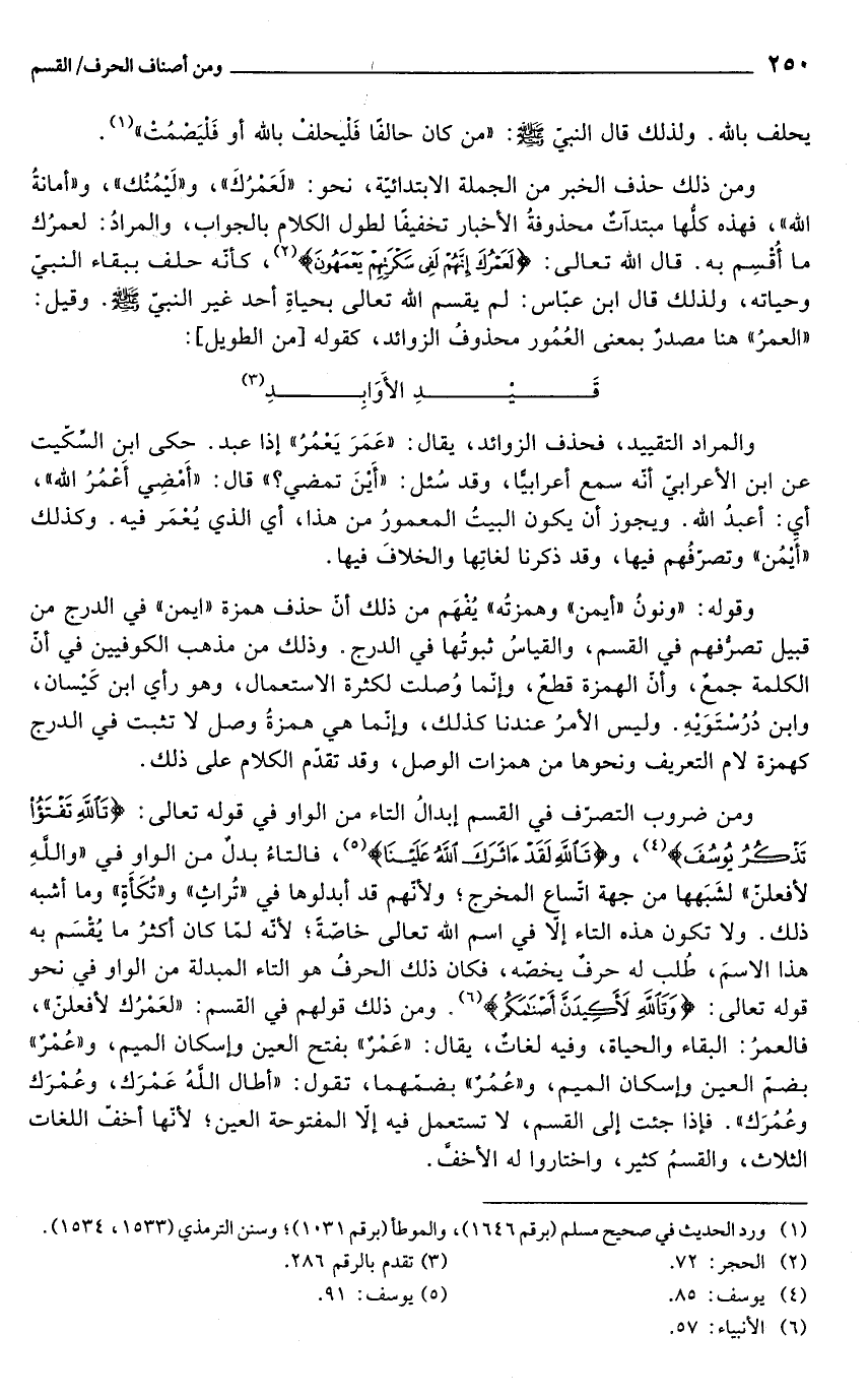 ومن ضروب التصرّف في القسم إبدالُ التاء من الواو في قوله تعالى: {تَاللَّهِ تَفْتَأُ تَذْكُرُ يُوسُفَ} (¬4)، و {تَاللَّهِ لَقَدْ آثَرَكَ اللَّهُ عَلَيْنَا} (¬5)، فالتاءُ بدلٌ من الواو في "واللَّهِ لأفعلنّ" لشَبَهها من جهة اتّساع المخرج؛ ولأنّهم قد أبدلوها في "تُراثٍ" و"تُكَأَةٍ" وما أشبه ذلك. ولا تكون هذه التاء إلّا في اسم الله تعالى خاصّةً؛ لأنّه لمّا كان أكثرُ ما يُقْسَم به هذا الاسمَ، طُلب له حرفٌ يخصّه، فكان ذلك الحرفُ هو التاء المبدلة من الواو في نحو قوله تعالى: {وَتَاللَّهِ لَأَكِيدَنَّ أَصْنَامَكُمْ} (¬6)، ومن ذلك قولهم في القسم: "لعَمْرُك لأفعلنّ"، فالعمرُ: البقاء والحياة، وفيه لغاتٌ، يقال: "عَمْرٌ" بفتح العين وإسكان الميم، و"عُمْرٌ" بضمّ العين وإسكان الميم، و"عُمُرٌ" بضمّهما، تقول: "أطال اللَّهُ عَمْرَك، وعُمْرَك وعُمُرَك". فإذا جئت إلى القسم، لا تستعمل فيه إلَّا المفتوحة العين؛ لأنّها أخفّ اللغات الثلاث، والقسمُ كثير، واختاروا له الأخفَّ.