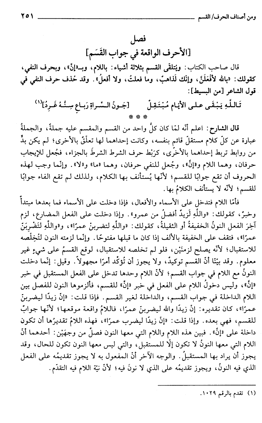 فأمّا اللام فتدخل على الأسماء والأفعال، فإذا دخلت على الأسماء فما بعدها مبتدأٌ وخبرٌ، كقولك: "واللَّهِ لَزيدٌ أفضلُ من عمرو". وإذا دخلت على الفعل المضارع، لزم آخِرَ الفعل النونُ الخفيفةُ أو الثقيلةُ، كقولك: "واللَّهِ لتضربنْ عمرًا"، و"واللَّهِ لتَضْرِبَنّ عمرًا"، فتقف على الخفيفة بالألف إذا كان ما قبلها مفتوحًا. وإنّما لزمته النون لتُخِلّصه للاستقبال؛ لأنّه يصلح لزمنَيْن، فلو لم تخلصه للاستقبال، لوقع القسمُ على شيءٍ غير معلوم. وقد بيّنّا أنّ القسم توكيدٌ، ولا يجوز أن تُؤكِّد أمرًا مجهولاً. وقيل: إنّما دخلت النونُ مع اللام في جواب القسم؛ لأنّ اللام وحدها تدخل على الفعل المستقبل في خبر "إنَّ"، وليس دخولُ اللام على الفعل في خبر "إنَّ" للقسم، فألزموها النون للفصل بين اللام الداخلة في جواب القسم، والداخلة لغير القسم. فإذا قلت: "إنّ زيدًا ليضربنّ عمرًا"، كان تقديره: إنّ زيدًا والله ليضربن عمرًا, فاللامُ واقعة موقعها؛ لأنّها جوابٌ للقسم، فهي بعده. وإذا قلت: "إنّ زيدًا ليضرب عمرًا"، فهذه اللامُ تقديرُها أن تكون داخلة على "إنَّ". فبين هذه اللام واللام التي معها النون فصلٌ من وجهَيْن: أحدهما أنّ اللام التي معها النونُ لا تكون إلّا للمستقبل، والتي ليس معها النون تكون للحال، وقد يجوز أن يراد بها المستقبلُ. والوجه الآخر أنّ المفعول به لا يجوز تقديمُه على الفعل الذي فيه النونُ، ويجوز تقديمُه على الذي لا نونَ فيه؛ لأنّ نيّة اللام فيه التقدّم.