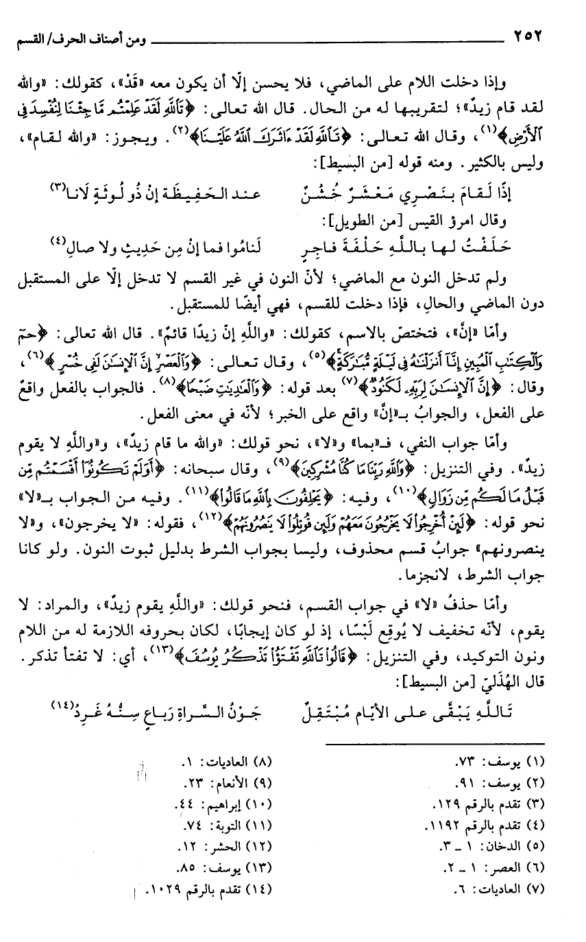 وأمّا "إنَّ"، فتختصّ بالاسم، كقولك: "واللَّهِ إنّ زيدًا قائمٌ". قال الله تعالى: {حم وَالْكِتَابِ الْمُبِينِ إِنَّا أَنْزَلْنَاهُ فِي لَيْلَةٍ مُبَارَكَةٍ} (¬5)، وقال تعالى: {وَالْعَصْرِ إِنَّ الْإِنْسَانَ لَفِي خُسْرٍ} (¬6)، وقال: {إِنَّ الْإِنْسَانَ لِرَبِّهِ لَكَنُودٌ} (¬7) بعد قوله: {وَالْعَادِيَاتِ ضَبْحًا} (¬8). فالجواب بالفعل واقعٌ على الفعل، والجوابُ بـ "إنَّ" واقع على الخبر؛ لأنّه في معنى الفعل.