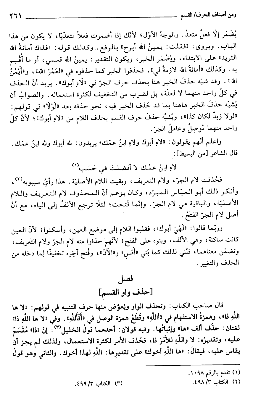 يُضمَر إلّا فعلٌ متعدٍّ. والوجهُ الأوّل؛ لأنّك إذا أضمرت فعلاً متعدّيًا، لا يكون من هذا الباب. ويروى: "فقلت: يمينُ الله أبرح" بالرفع. وكذلك قوله: "فذاك أمانةُ الله الثريد" على الابتداء، ويُضْمَر الخبر، ويكون التقدير: يمينُ الله قسمي، أو ما أُقْسِم به. وكذلك "أمانةُ الله لازمةٌ لي"، فحذفوا الخبر كما حذفوه في "لعَمْرُ الله"، و"أَيْمُنُ الله". وقد شبّه حذفَ الخبر هنا بحذف حرف الجرّ في "لَاهِ أبوك". يريد أنّ الحذف في كل واحد منهما لا لعلّة، بل لضرب من التخفيف لكثرة استعماله. والصوابُ أن يُشبه حذفَ الخبر ها هنا بما قد حُذف الخبر فيه، نحو حذفه بعد "لَوْلَا" في قولهم: "لولا زيدٌ لكان كذا"، ويُشبِّه حذفَ حرف القسم بحذف اللام من "لاهِ أبوك"؛ لأن كلّ واحد منهما مُوصِلٌ وعاملُ الجرّ.