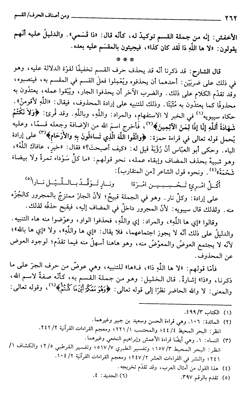 فأمّا قولهم: "لا ها اللهِ ذا"، فـ "ها" للتنبيه، وهي عوضٌ من حرف الجرّ على ما ذكرنا، و"ذا" إشارةٌ. قال الخليل: وهو من جملة القسم به، كأنّه صفةٌ لاسم الله، والمعنى: لا والله الحاضر نظرًا إلى قوله تعالى: {وَهُوَ مَعَكُمْ أَيْنَ مَا كُنْتُمْ} (¬6)، وقوله تعالى: