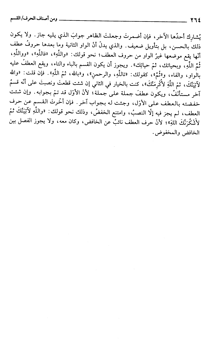 يُشارِك أحدُها الآخر، فإن أضمرتَ وجعلتَ الظاهر جواب الذي يليه جاز. ولا يكون ذلك بالحسن، بل يتأويل ضعيف. والذي يدلّ أن الواو الثانية وما بعدها حروفُ عطف أنّها يقع موضعها غيرُ الواو من حروف العطف؛ نحو قولك: "واللهِ"، "فاللهِ"، "وواللهِ، ثُمَّ اللهِ، وبحياتك، ثمّ حياتِك". ويجوز أن يكون القسم بالباء والتاء، ويقع العطفُ عليه بالواو، والفاء، و"ثُمَّ"، كقولك: "تالله, والرحمنِ"، و"بالله، ثمّ اللهِ". فإن قلت: "والله لآتيَنَّكَ، ثمّ الله لأُكرِمَنَّكَ"، كنت بالخيار في الثاني إن شئت قطعتَ ونصبتَ على أنّه قسمٌ آخر مستأنَفٌ، ويكون عطفَ جملة على جملة؛ لأنّ الأوّل قد تم بجوابه. وإن شئت خفضته بالعطف على الأوّل، وجئت له بجواب آخر. فإن أخّرتَ القسم عن حرف العطف، لم يجز فيه إلا النصبُ، وامتنع الخفضُ، وذلك نحو قولك: "واللهِ لآتِينَّكَ ثمّ لأَشكُرَنَّكَ اللهِ"؛ لأنّ حرف العطف نائبٌ عن الخافض، وكان معه، ولا يجوز الفصل بين الخافض والمخفوض.