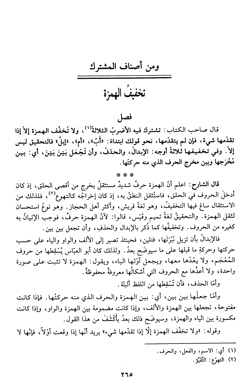 قال الشارح: اعلم أنّ الهمزة حرفٌ شديدٌ مستثقلٌ يخرج من أقصى الحلق، إذ كان أدخلَ الحروف في الحلق، فاستُثقل النطقُ به، إذ كان إخراجُه كالتهوع (¬2)، فلذلك من الاستثقال ساغ فيها التخفيفُ، وهو لغةُ قريش، وأكثر أهل الحجاز. وهو نوعُ استحسان لثقل الهمزة. والتحقيقُ لغةُ تميم وقَيْس، قالوا: لأنّ الهمزة حرفٌ، فوجب الإتيانُ به كغيره من الحروف. وتخفيفُها كما ذُكر بالإبدال والحذفِ، وأن تجعل بين بين.