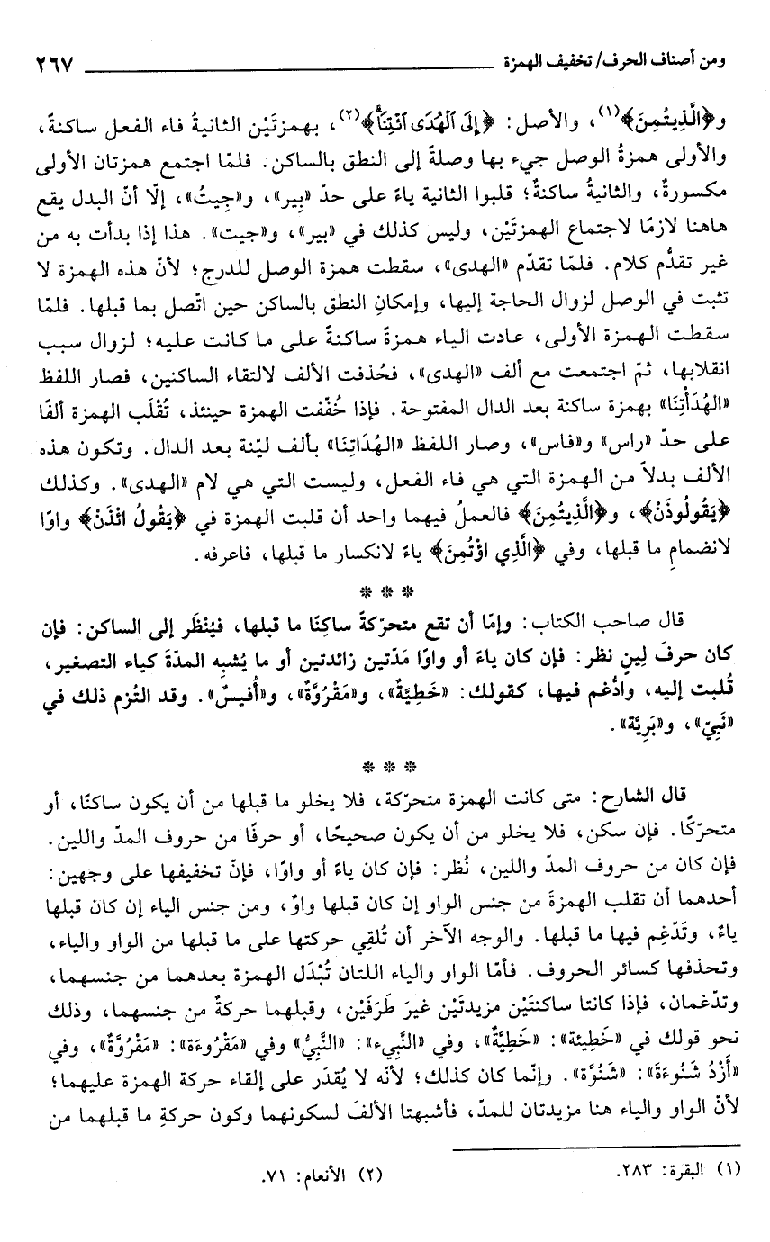 قال الشارح: متى كانت الهمزة متحرّكة، فلا يخلو ما قبلها من أن يكون ساكنًا، أو متحرّكًا. فإن سكن، فلا يخلو من أن يكون صحيحًا، أو حرفًا من حروف المدَّ واللين. فإن كان من حروف المدّ واللين، نُظر: فإن كان ياءً أو واوًا، فإنّ تخفيفها على وجهين: أحدهما أن تقلب الهمزةَ من جنس الواو إن كان قبلها واوٌ، ومن جنس الياء إن كان قبلها ياءٌ، وتَدّغِم فيها ما قبلها. والوجه الآخر أن تُلقِي حركتها على ما قبلها من الواو والياء، وتحذفها كسائر الحروف. فأمّا الواو والياء اللتان تُبْدَل الهمزة بعدهما من جنسهما، وتدّغمان، فإذا كانتا ساكنتْين مزيدتَيْن غيرَ طَرَفَيْن، وقبلهما حركةٌ من جنسهما، وذلك نحو قولك في "خَطِيئة": "خَطيَّةٌ"، وفي "النَّبِيء": "النَّبِيُّ" وفي "مَقْرُوءَة": "مَقْرُؤَّةٌ"، وفي "أَزْدُ شَنُوءَةَ": "شَنُوَّة". وإنّما كان كذلك؛ لأنّه لا يُقدَر على إلقاء حركة الهمزة عليهما؛ لأنّ الواو والياء هنا مزيدتان للمدّ، فأشبهتا الألفَ لسكونهما وكون حركةِ ما قبلهما من