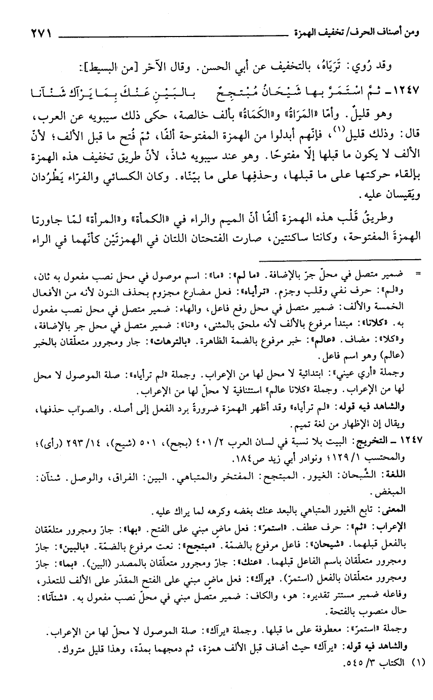 وجملة "استمرّ": معطوفة على ما قبلها. وجملة "يرآك": صلة الموصول لا محلّ لها من الإعراب. والشاهد فيه قوله: في يرآك" حيث أضاف قبل الألف همزة، ثم دمجهما بمدّة، وهذا قليل متروك.