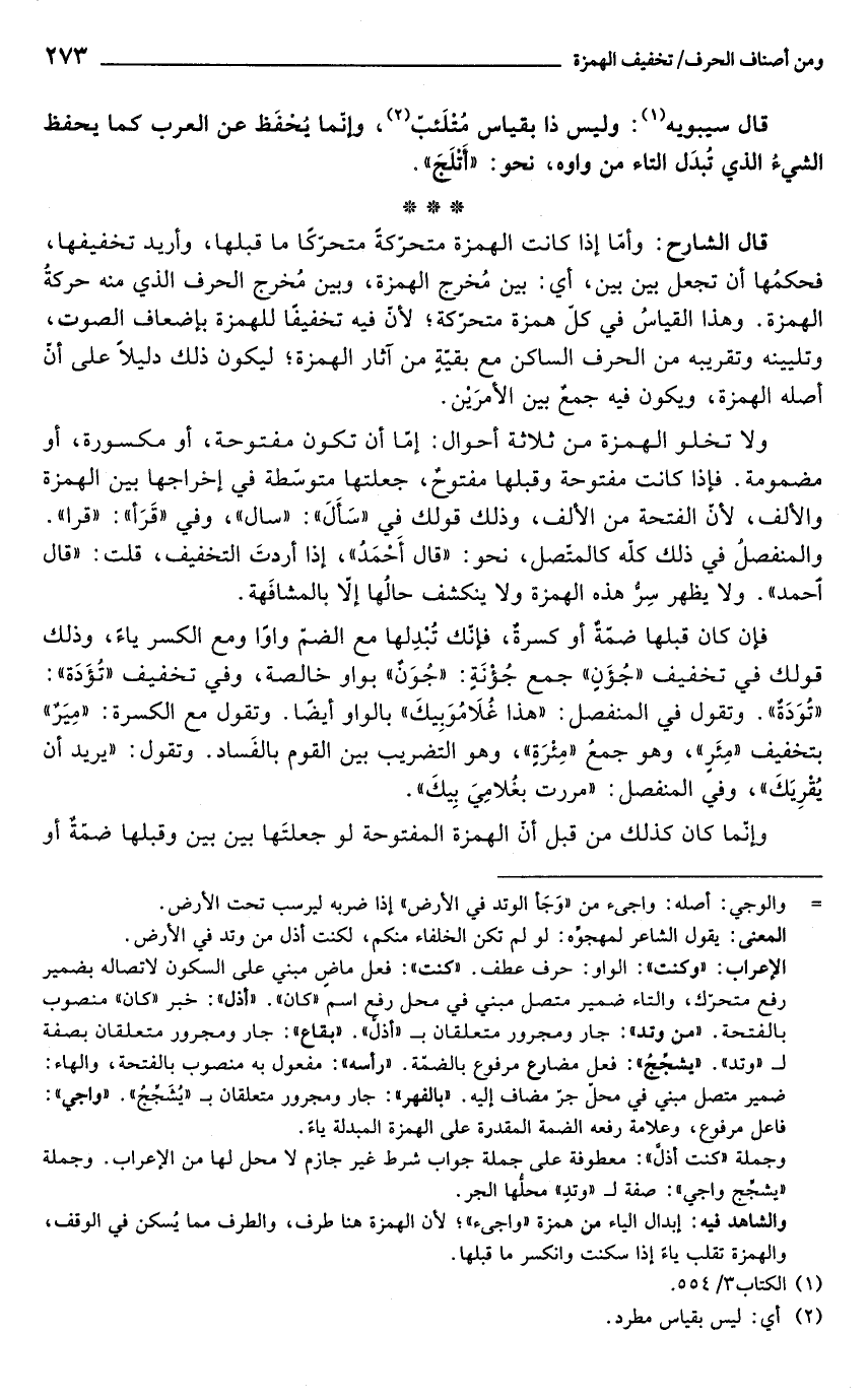 ولا تخلو الهمزة من ثلاثة أحوال: إمّا أن تكون مفتوحة، أو مكسورة، أو مضمومة. فإذا كانت مفتوحة وقبلها مفتوح، جعلتها متوسّطة في إخراجها بين الهمزة والألف, لأنّ الفتحة من الألف، وذلك قولك في "سَأَلَ": "سال"، وفي "قَرَأ": "قرا". والمنفصلُ في ذلك كلّه كالمتّصل، نحو: "قال أَحْمَدُ"، إذا أردتَ التخفيف، قلت: "قال أحمد". ولا يظهر سِرُّ هذه الهمزة ولا ينكشف حالُها إلّا بالمشافَهة.