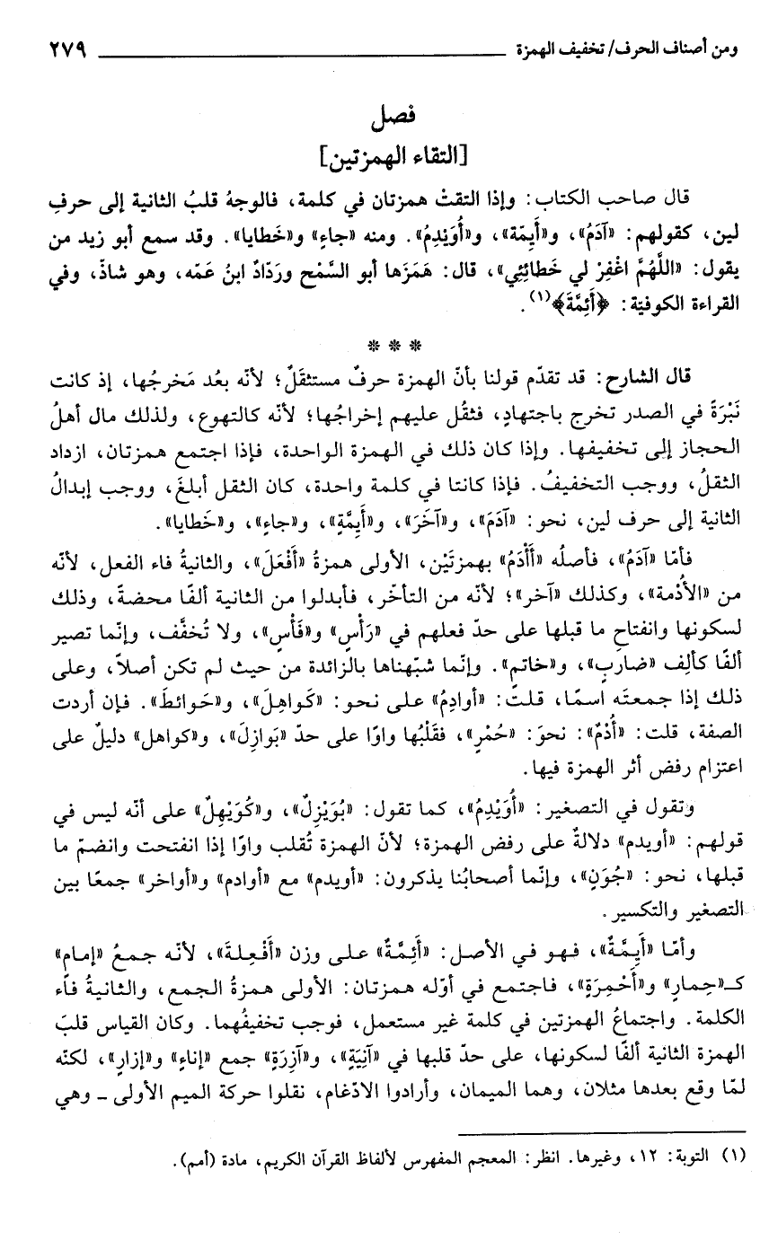 قال الشارح: قد تقدّم قولنا بأنّ الهمزة حرفٌ مستثقَلٌ؛ لأنّه بعُد مَخرجُها، إذ كانت نَبْرَةً في الصدر تخرج باجتهادٍ، فثقُل عليهم إخراجُها؛ لأنّه كالتهوع، ولذلك مال أهلُ الحجاز إلى تخفيفها. وإذا كان ذلك في الهمزة الواحدة، فإذا اجتمع همزتان، ازداد الثقلُ، ووجب التخفيفُ. فإذا كانتا في كلمة واحدة، كان الثقل أبلغَ، ووجب إبدالُ الثانية إلى حرف لين، نحو: "آدَمَ"، و"آخَرَ"، و"أَيِمَّةٍ"، و"جاءِ"، و"خَطايا".