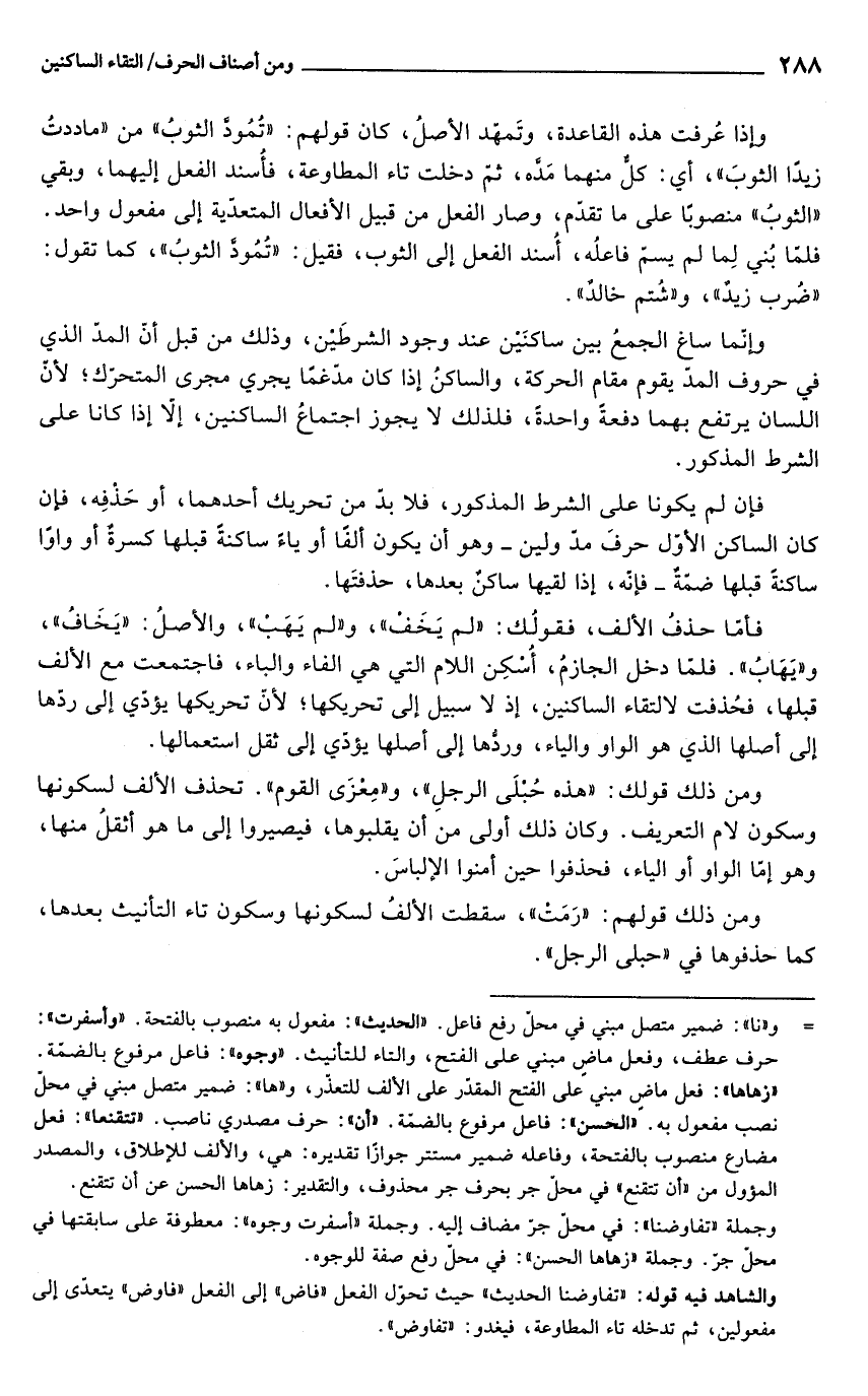 وإنّما ساغ الجمعُ بين ساكنَيْن عند وجود الشرطَيْن، وذلك من قبل أنّ المدّ الذي في حروف المدّ يقوم مقام الحركة، والساكنُ إذا كان مدّغمًا يجري مجرى المتحرّك؛ لأنّ اللسان يرتفع بهما دفعةً واحدةً، فلذلك لا يجوز اجتماعُ الساكنين، إلّا إذا كانا على الشرط المذكور.