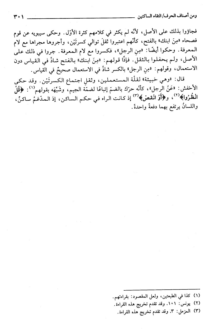 فجاؤوا بذلك على الأصل، لأنّه لم يكثر في كلامهم كثرة الأوّل. وحكى سيبويه عن قوم فصحاء "مِنَ ابنك" بالفتح، كأنّهم اعتبروا ثقلَ توالي كسرتَيْن، وأجروها مجراها مع لام المعرفة. وحكوا أيضًا: "مِنِ الرجل"، فكسروا مع لام المعرفة. جروا في ذلك على الأصل، ولم يحفلوا بالثقل. فإذًا قولهم: "مِنَ ابنك" بالفتح شاذّ في القياس دون الاستعمال، وقولهم: "مِنِ الرجل" بالكسر شاذً في الاستعمال صحيحٌ في القياس.