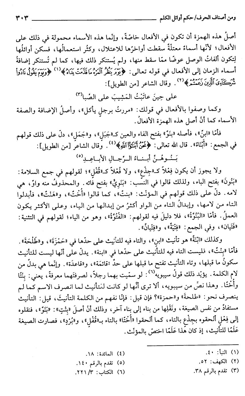 فأمّا "ابنٌ"، فأصله "بنَوٌ" بفتح الفاء والعين كـ"جَبَلٍ"، و"جَمَلٍ"، دلّ على ذلك قولهم في الجمع: "أَبْنَاءٌ". قال الله تعالى: {نَحْنُ أَبْنَاءُ اللَّهِ} (¬4). وقال الشاعر [من الطويل]: