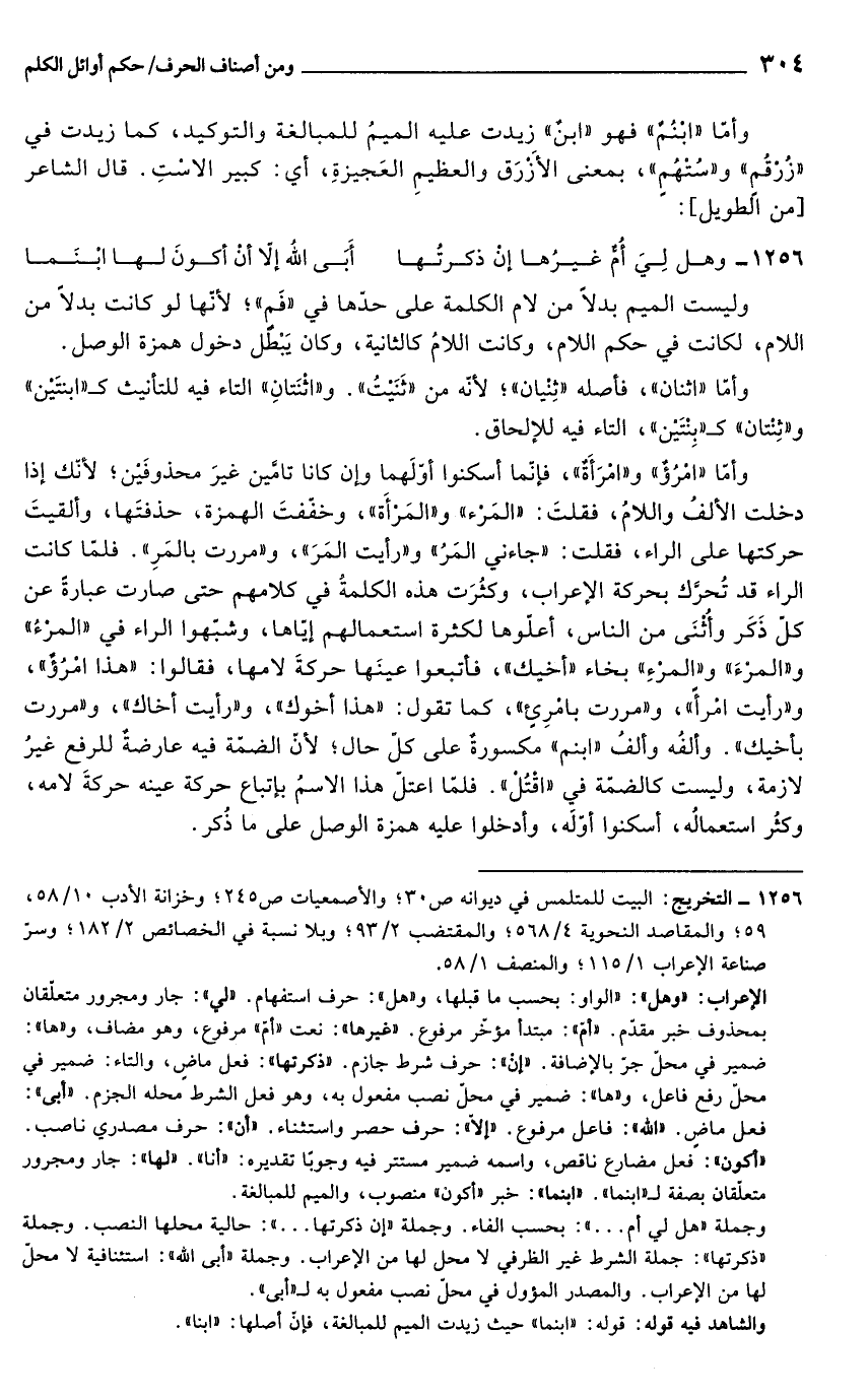 الإعراب: "وهل": "الواو: بحسب ما قبلها، و"هل": حرف استفهام. "لي": جار ومجرور متعلّقان بمحذوف خبر مقدّم. "أمّ": مبتدأ مؤخّر مرفوع. "غيرها": نعت "أمّ" مرفوع، وهو مضاف، و"ها": ضمير في محلّ جرّ بالإضافة. "إنْ": حرف شرط جازم. "ذكرتها": فعل ماضٍ، والتاء: ضمير في محلّ رفع فاعل، و"ها": ضمير في محلّ نصب مفعول به، وهو فعل الشرط محله الجزم. "أبى": فعل ماضٍ. "الله": فاعل مرفوع. "إلّا": حرف حصر واستثناء. "أن": حرف مصدري ناصب. "أكون": فعل مضارع ناقص، واسمه ضمير مستتر فيه وجوبًا تقديره: "أنا". "لها": جار ومجرور متعلّقان بصفة لـ "ابنما". "ابنما": خبر "أكون" منصوب، والميم للمبالغة.