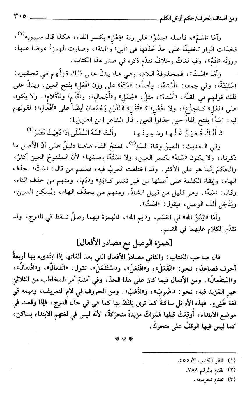 قال صاحب الكتاب: والثاني مصادر الأفعال التي بعد ألفاتها إذا ابتديء بها أربعة أحرف فصاعداً, نحو انفعل وافتعل واستفعل تقول: انفعال وافتعال واستفعال، ومن الأفعال فيما كان على هذا الحد، وفي أمثلة أمر المخاطب من الثلاثي غير المزيد فيه نحو اضرب واذهب. ومن الحروف في لام التعريف وميمه في لغة طييء. فهذه الأوائل ساكنة كما ترى يلفظ بها كما هي في حال الدرج، فإذا وقعت في موضع الابتداء, أُوقعت قبلها همزات ومزيدة متحركة، لأنه ليس في لغتهم الابتداء بساكن, كما ليس فيها الوقوف على متحرك.