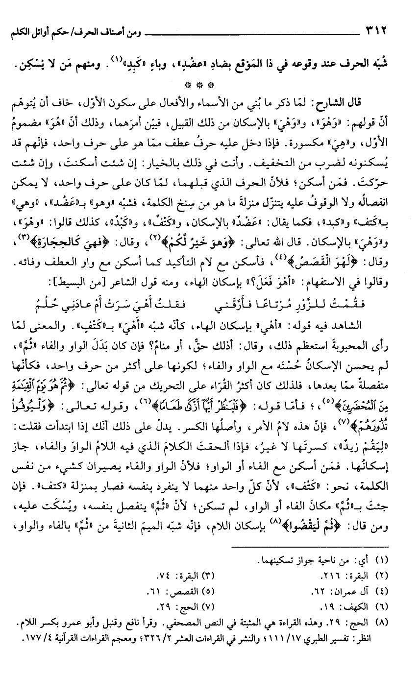 قال الشارح: لمّا ذكر ما بُني من الأسماء والأفعال على سكون الأول، خاف أن يُتوهّم أن قولهم: "وَهْوَ"، و"وَهْيَ" بالإسكان من ذلك القبيل، فبيّن أمرَهما، وذلك أن "هُوَ" مضمومُ الأوّل، و"هِىَ" مكسورة. فإذا دخل عليه حرفُ عطف ممّا هو على حرف واحد، فإنّهم قد يُسكنونه لضرب من التخفيف. وأنت في ذلك بالخيار: إن شئت أسكنتَ، وإن شئت حرّكتَ. فمَن أسكن؛ فلأنّ الحرف الذي قبلهما، لمّا كان على حرف واحد، لا يمكن انفصالُه ولا الوقوفُ عليه يتنزّل منزلةَ ما هو من سِنخ الكلمة، فشبّه "وهو" بـ "عَضُد"، "وهي" بـ"كَتف" و"كبد"، فكما يقال: "عَضْدٌ" بالإسكان، و"كَتْفٌ", و"كَبْدٌ"، كذلك قالوا: "وهْوَ"، و"وَهْيَ" بالإسكان. قال الله تعالى: {وَهوَ خَيْرٌ لَّكُمْ} (¬2)، وقال: {فهيَ كَالحِجَارَة} (¬3)، وقال: {لَهْوَ الْقَصَصُ} (¬4)، فأسكن مع لام التأكيد كما أسكن مع واو العطف وفائه. وقالوا في الاستفهام: "أهْوَ فَعَلَ؟ " بإسكان الهاء، ومنه قول الشاعر [من البسيط]: