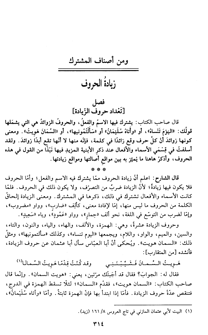 قال الشارح: اعلم أنّ زيادة الحروف ممّا يشترك فيه الاسم والفعل؛ وأمّا الحروف فلا يكون فيها زيادةٌ؛ لأنّ الزيادة ضربٌ من التصرّف، ولا يكون ذلك في الحروف. فلمّا كانت الأسماء والأفعال تشترك في ذلك، ذكرها في المشترك. ومعنى الزيادة إلحاقُ الكلمة من الحروف ما ليس منها، إمّا لإفادة معنى، كألِف "ضاربٍ"، وواو"مضروب"، وإمّا لضرب من التوسّع في اللغة، نحو ألف "حِمارِ"، وواو"عَمود"، وياء "سَعِيدٍ".
