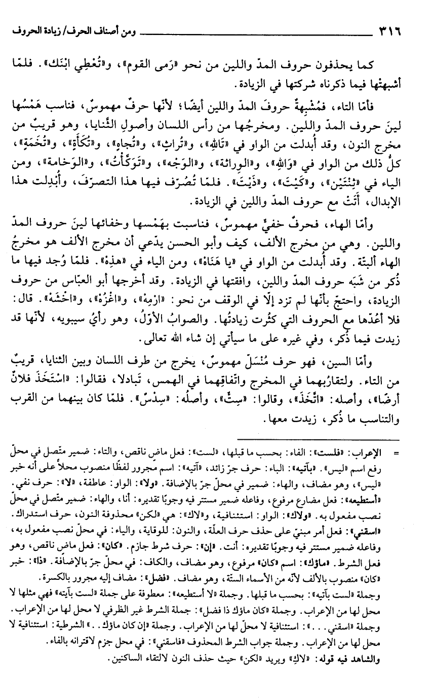 وأمّا الهاء، فحرفٌ خفيّ مهموسٌ، فناسبت بهَمْسها وخفائها لينَ حروف المدّ واللين. وهي من مخرج الألف، كيف وأبو الحسن يدّعي أن مخرج الألف هو مخرجُ الهاء ألبتّة. وقد أُبدلت من الواو في "يا هَنَاه"، ومن الياء في "هذِه". فلمّا وُجد فيها ما ذُكر من شَبَه حروف المدّ واللين، وافقتها في الزيادة. وقد أخرجها أبو العبّاس من حروف الزيادة، واحتجّ بأنّها لم تزد إلّا في الوقف من نحو: "ارْمِهْ"، و"اغزُه"، و"اخْشَهْ". قال: فلا أعُدّها مع الحروف التي كثُرت زيادتُها. والصوابُ الأوّلُ، وهو رأيُ سيبويه، لأنّها قد زيدت فيما ذُكر، وفي غيره على ما سيأتي إن شاء الله تعالى.