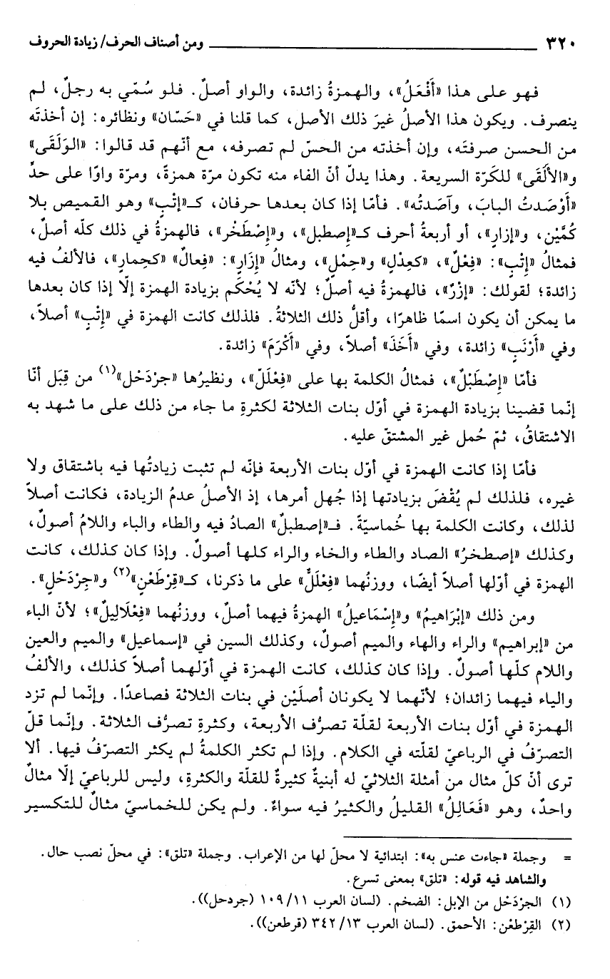 فأمّا إذا كانت الهمزة في أوّل بنات الأربعة فإنّه لم تثبت زيادتُها فيه باشتقاق ولا غيره، فلذلك لم يُقْضَ بزيادتها إذا جُهل أمرها، إذ الأصلُ عدمُ الزيادة، فكانت أصلاً لذلك، وكانت الكلمة بها خُماسيّةً. فـ "إصطبلٌ" الصادُ فيه والطاء والباء واللامُ أصولٌ، وكذلك "إصطخرُ" الصاد والطاء والخاء والراء كلها أصولٌ. وإذا كان كذلك، كانت الهمزة في أوّلها أصلاً أيضاً، ووزنُهما "فِعْلَلٌّ" على ما ذكرنا، كـ"قِرْطَعنٍ" (¬2) و"جِرْدَحْلٍ".