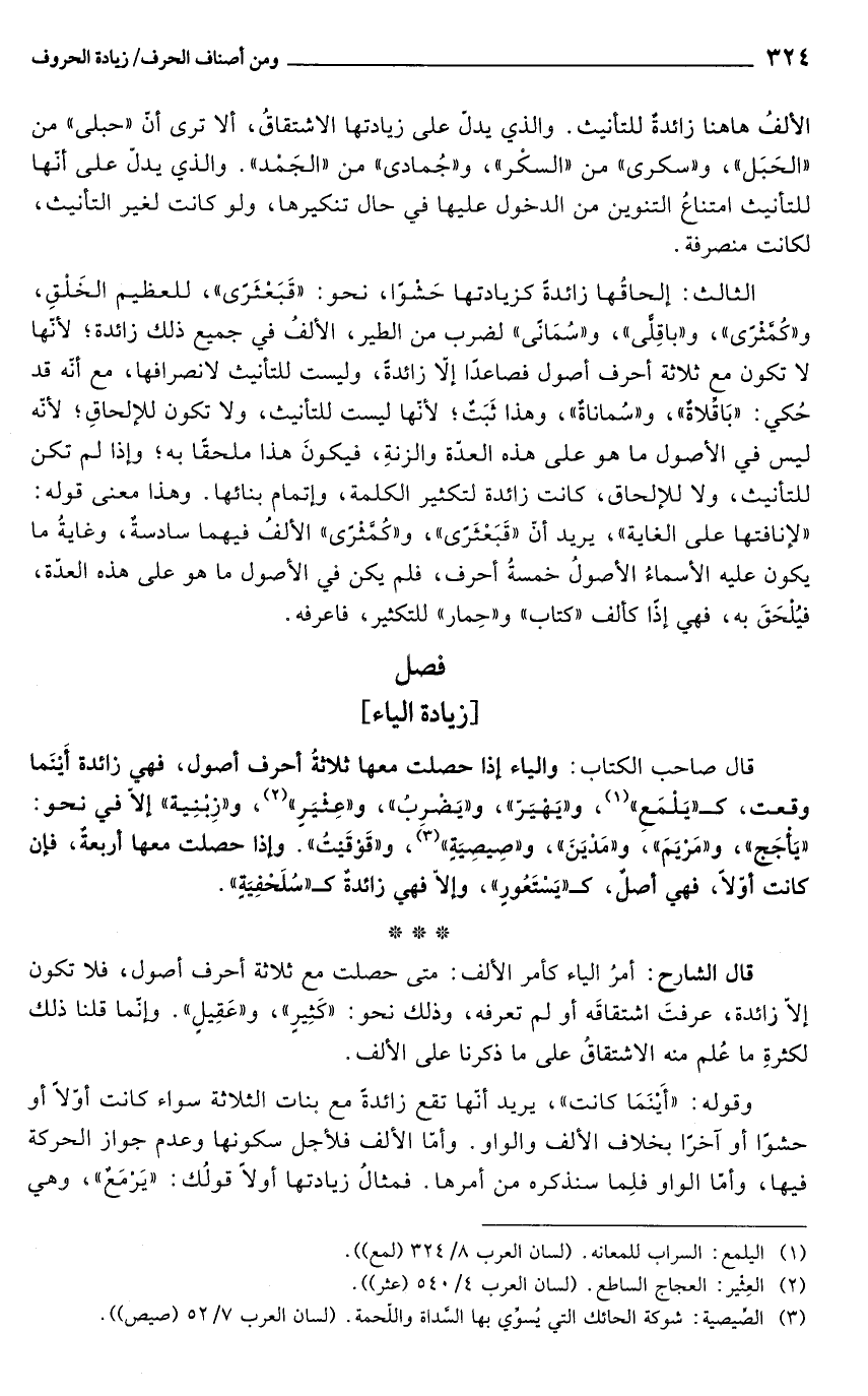 قال الشارح: أمرُ الياء كأمر الألف: متى حصلت مع ثلاثة أحرف أصول، فلا تكون إلّا زائدة، عرفتَ اشتقاقَه أو لم تعرفه، وذلك نحو: "كَثِير"، و"عَقِيلٍ". وإنّما قلنا ذلك لكثرةِ ما عُلم منه الاشتقاقُ على ما ذكرنا على الألف.