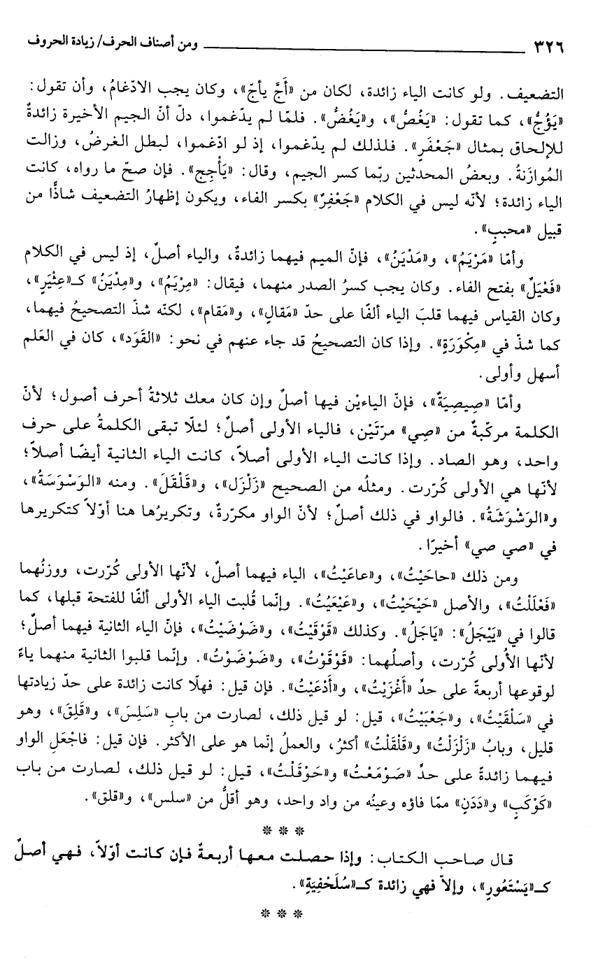 وأمّا "صِيصِيَةٌ"، فإنّ الياءيْن فيها أصلٌ وإن كان معك ثلاثةُ أحرف أصول؛ لأنّ الكلمة مركبةٌ من "صِي" مرّتَين، فالياء الأولى أصلٌ؛ لئلا تبقى الكلمةُ على حرف واحد، وهو الصاد. وإذا كانت الياء الأولى أصلاً، كانت الياء الثانية أيضًا أصلاً؛ لأنّها هى الأولى كُرّرت. ومثلُه من الصحيح "زَلْزَل"، و"قَلْقَلَ". ومنه "الوَسْوَسَةُ"، و"الوَشوشَةُ". فالواو في ذلك أصلٌ؛ لأنّ الواو مكرّرةٌ، وتكريرُها هنا أوّلاً كتكريرها في "صي صي" أخيرًا.