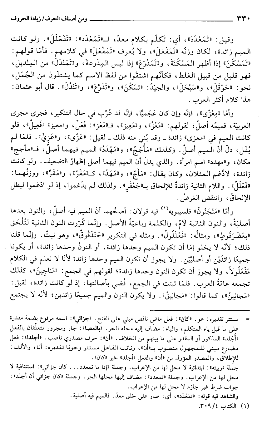 وقيل: "تَمَعْدَدَ"، أي: تَكلّم بكلام معدّ، فـ "تَمَعّدَد": "تَفَعْلَلَ". ولو كانت الميم زائدة، لكان وزنُه "تَمَفعَلَ", ولا يُعرف "تَمَفعَلَ" في كلامهم. فأمّا قولهم: "تَمَسْكَنَ" إذا أظهر المسكَنَةَ، و"تَمَدْرَعَ" إذا لبس المِدْرعةَ، و"تَمَنْدَلَ" من المِنْديل، فهو قليل من قبيل الغلط، فكأنّهم اشتقّوا من لفظ الاسم كما يشتقّون من الجُمَل، نحو: "حَوْقَلَ"، و"سَبْحَلَ"، والجيدُ: "تَسَكّنَ"، و"تَدَرَّعَ"، و"تَنَدَّلَ". قال أبو عثمان: هذا كلام أكثر العرب.