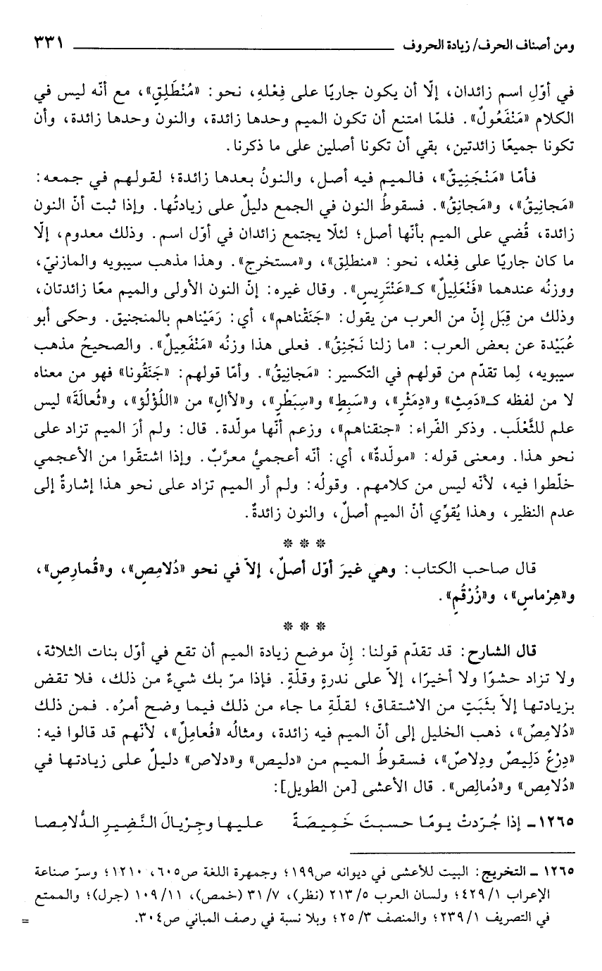 قال الشارح: قد تقدّم قولنا: إِنّ موضع زيادة الميم أن تقع في أوّل بنات الثلاثة، ولا تزاد حشوًا ولا أخيرًا، إلّا على ندرةٍ وقلةٍ. فإذا مرّ بك شيءٌ من ذلك، فلا تقض بزيادتها إلّا بثَبَتٍ من الاشتقاق؛ لقلّةِ ما جاء من ذلك فيما وضح أمرُه. فمن ذلك "دُلامِصٌ"، ذهب الخليل إلى أنّ الميم فيه زائدة، ومثالُه "فعامِلٌ"؛ لأنّهم قد قالوا فيه: "دِرْعٌ دَلِيصٌ ودِلاصٌ"، فسقوطُ الميم من "دليص" و"دلاص" دليلٌ على زيادتها في "دُلامِص" و"دُمالِص". قال الأعشى [من الطويل]: