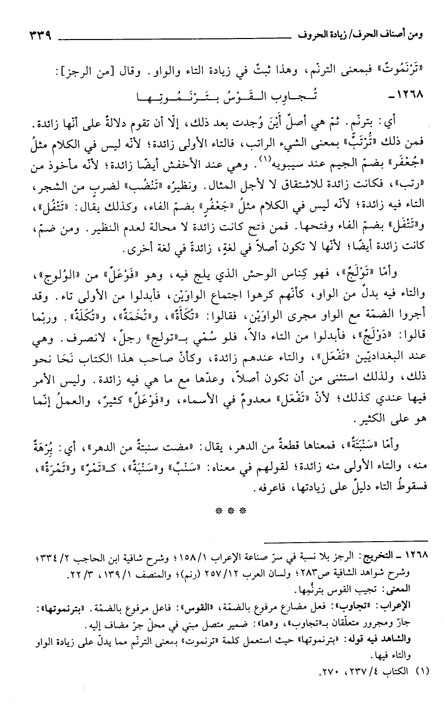 والشاهد فيه قوله: "بترنموتها" حيث استعمل كلمة "ترنموت" بمعنى الترنّم مما يدلّ على زيادة الواو والتاء فيها.