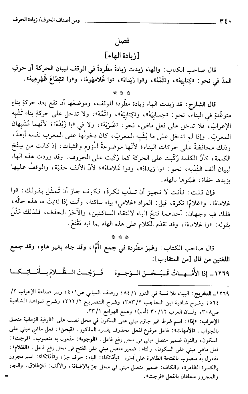 قال الشارح: قد زيدت الهاء زيادة مطّردة للوقف، وموضعُها أن تقع بعد حركةِ بناءٍ متوغّلةٍ في البناء، نحو: "حِسابِيَهْ"، و"كِتابِيَهْ"، و"ثَمَّهْ"، ولا تدخل على حركةِ بناء تُشبِه الإعرابَ، فلا تدخل على فعل ماض، نحو: "ضَرَبَهْ"، ولا في "يا زَيْدُهْ"؛ لأنّهما مُشْبِهان المعربَ. وإذا لم تدخل على ما يُشْبِه المعربَ، كان دخولُها على المعرب نفسه أبعدَ، وذلك محافَظةٌ على حركات البناء؛ لأنّها موضوعةٌ للُّزوم والثبات، إذ كانت من سِنْخ الكلمة، كأنّ الكلمة رُكّبت على الحركة كما رُكّبت على الحروف. وقد وردت هذه الهاء لبيان ألف النُّدْبة، نحو: "وا زيداهْ"، و"وا غُلاماهُ"؛ لأنّ الألف خفيّة، والوقفُ عليها يزيدها خفاءً، فبيّنوها بالهاء.