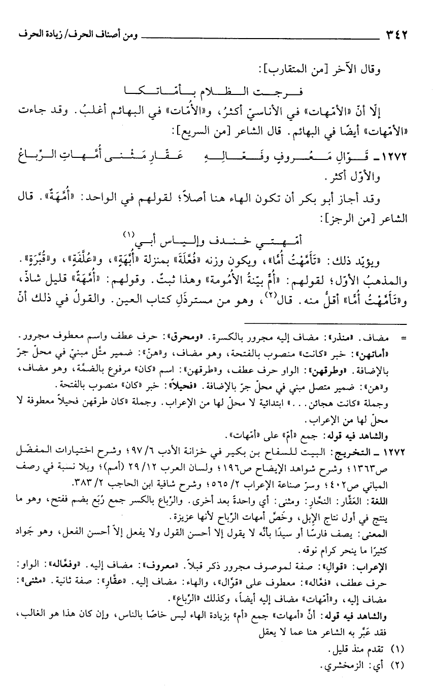 والشاهد فيه قوله: أنَّ "أمهات" جمع "أم" بزيادة الهاء لس خاصًا بالناس، وإن كان هذا هو الغالب، فقد عَبَّر به الشاعر هنا عما لا يعقل.