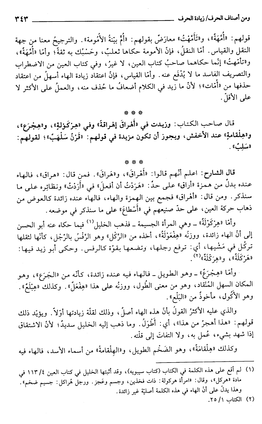والذي عليه الأكثرُ القولُ بأن هذه الهاء أصلٌ، وذلك لقلّة زيادتها أوّلًا. ويؤيّد ذلك قولهم: "هذا أهجرُ من هذا"، أي: أَطوَلُ. وما ذهب إليه الخليل سديدٌ؛ لأنّ الاشتقاق إذا شهد بشيء، عُمل به، ولا التفاتَ إلى قلّته.