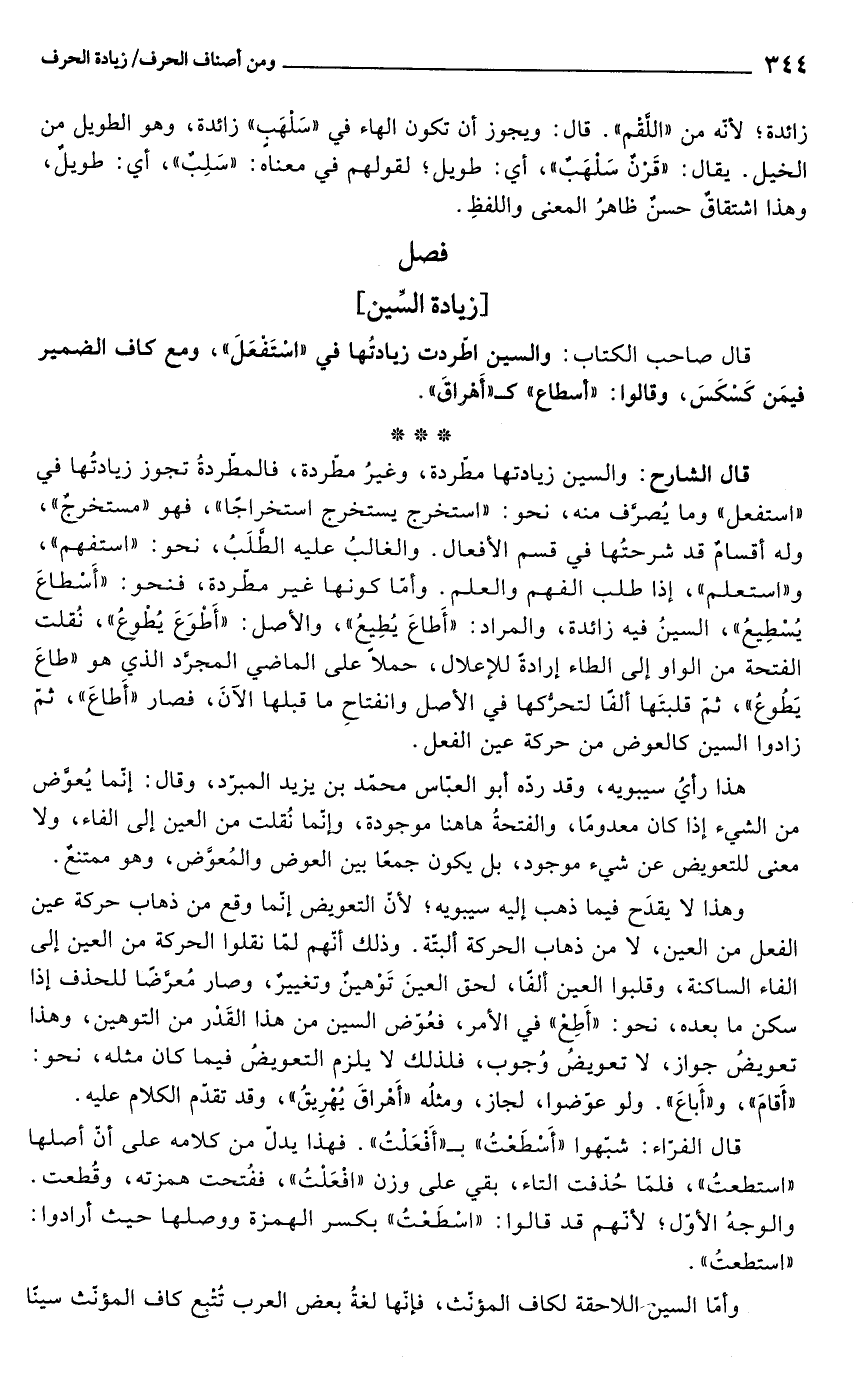 قال الشارح: والسين زيادتها مطّردة, وغيرُ مطّردة، فالمطّردةُ تجوز زيادتُها في "استفعل" وما يُصرِّف منه، نحو: "استخرج يستخرج استخراجًا"، فهو"مستخرجٌ"، وله أقسامٌ قد شرحتُها في قسم الأفعال. والغالبُ عليه الطَّلَبُ، نحو: "استفهم"، و"استعلم"، إذا طلب الفهم والعلم. وأمّا كونها غير مطّردة، فنحو: "أَسْطاعَ يُسْطِيعُ"، السينُ فيه زائدة، والمراد: "أَطاعَ يُطِيعُ"، والأصل: "أَطوَعَ يُطوعُ"، نُقلت الفتحة من الواو إلى الطاء إرادةً للإعلال، حملًا على الماضي المجرَّد الذي هو "طاعَ يَطُوعُ"، ثمّ قلبتَها ألفًا لتحرُّكها في الأصل وانفتاحِ ما قبلها الآنَ، فصار "أَطاعَ"، ثمّ زادوا السين كالعوض من حركة عين الفعل.