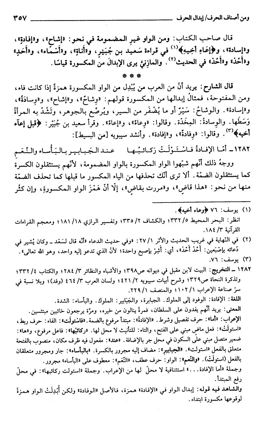 قال الشارح: يريد أنّ من العرب من يُبدِل من الواو المكسورة همزةً إذا كانت فاء، ومن المفتوحة، فمثالُ إبدالها من المكسورة قولهم: "وِشاحٌ"، و"إشاح"، و"وِسادَةٌ"، و"إسادة". والوشاحُ: سَيرٌ أو ما يُضفَر من السير، ويُرصَّع بالجوهر، وتَشُدّ به المرأةُ وَسَطَها. والوِسادةُ: المِخَدّة. وقالوا: "وعاءٌ"، و"إعاءٌ". وقرأ سعيد بن جُبَير: {قبل إعآء أخيه} (¬3). وقالوا: "وِفادةٌ"، و"إفادة". وأنشد سيبويه [من البسيط]: