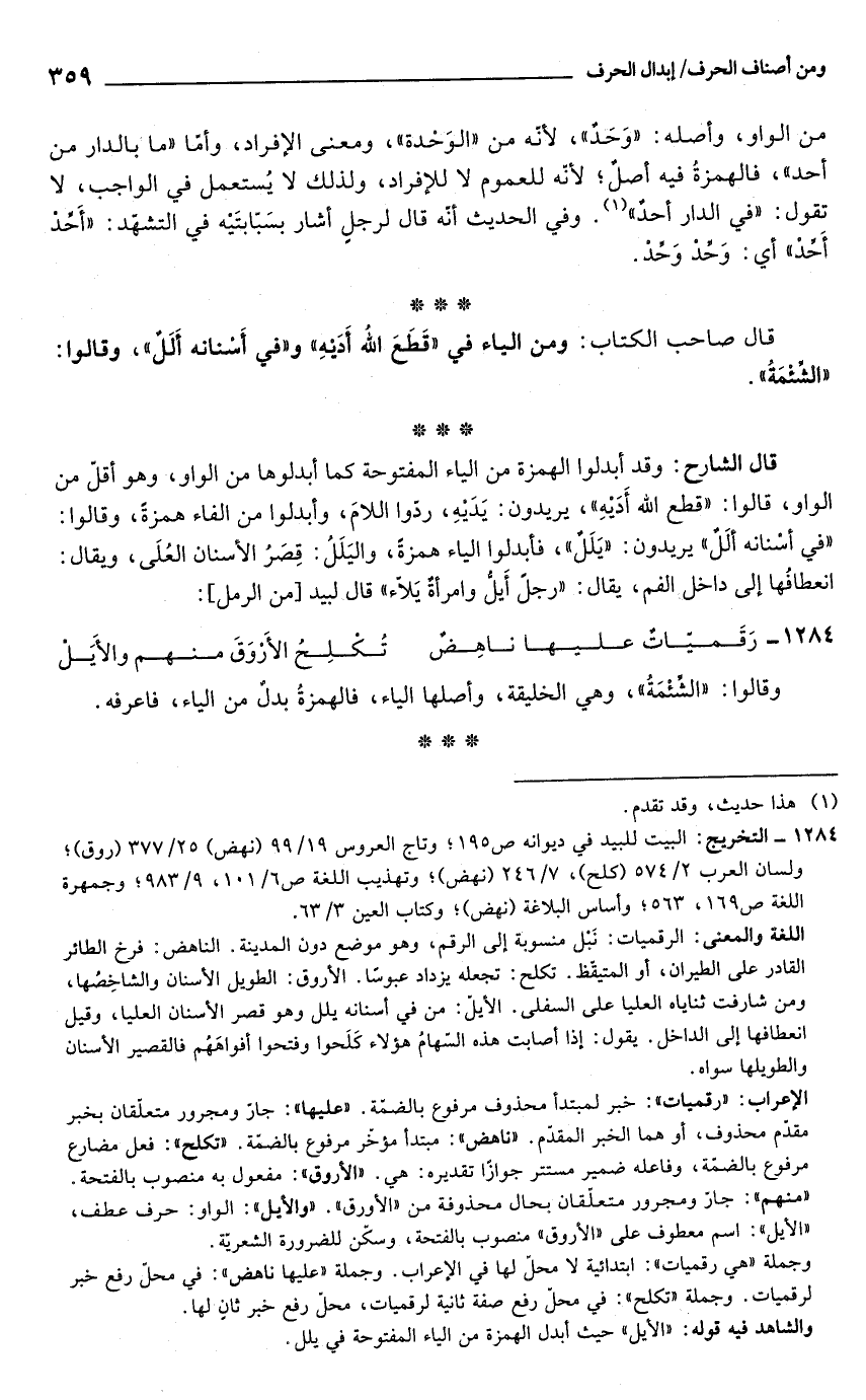 قال الشارح: وقد أبدلوا الهمزة من الياء المفتوحة كما أبدلوها من الواو، وهو أقلّ من الواو، قالوا: "قطع الله أَدَيْهِ"، يريدون: يَدَيهِ، ردّوا اللامَ، وأبدلوا من الفاء همزةً، وقالوا: "في أسْنانه ألَلٌ" يريدون: "يَلَلٌ"، فأبدلِوا الياء همزةً، واليَلَلُ: قِصَرُ الأسنان العُلَى، ويقال: انعطافُها إلى داخل الفم، يقال: "رجلً أيلُّ وامرأةٌ يَلاّء" قال لبيد [من الرمل]: