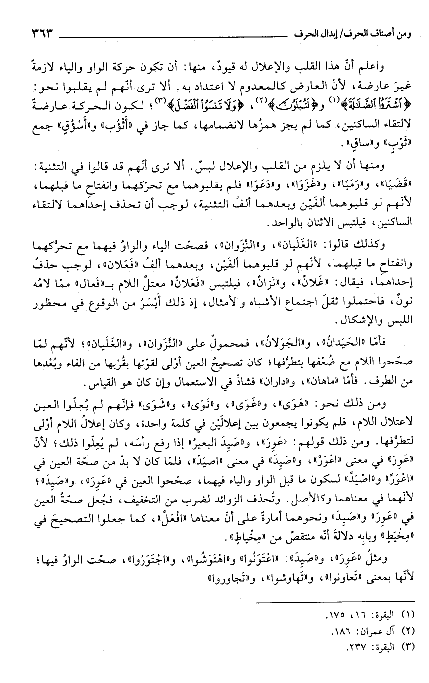 واعلم أنّ هذا القلب والإعلال له قيودٌ، منها: أن تكون حركة الواو والياء لازمةً غير عارضة, لأنّ العارض كالمعدوم لا اعتداد به. ألا ترى أنّهم لم يقلبوا نحو: {اشْتَرَوُا الضَّلَالَةَ} (¬1) و {لَتُبْلَوُنَّ} (¬2) , {وَلَا تَنْسَوُا الْفَضْلَ} (¬3)؛ لكون الحركة عارضةً لالتقاء الساكنين، كما لم يجز همزُها لانضمامها، كما جاز في "أَثْؤُب" و"أَسْؤُقٍ" جمع "ثَوْبٍ" و"ساقٍ".