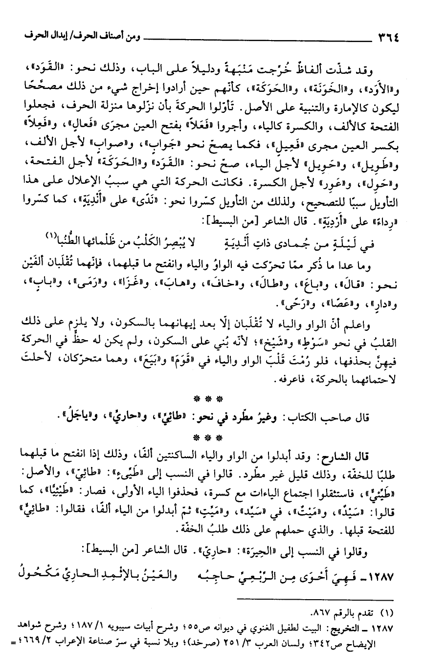 قال الشارح: وقد أبدلوا من الواو والياء الساكنتين ألفًا، وذلك إذا انفتح ما قبلهما طلبًا للخفّة، وذلك قليل غير مطّرد. قالوا في النسب إلى "طَيّىءٍ": "طائِيّ"، والأصل: "طَيّئيٌّ"، فاستثقلوا اجتماع الياءات مع كسرة، فحذفوا الياء الأولى، فصار: "طَيْئِيًّا"، كما قالوا: "سَيْدٌ"، و"مَيْتٌ"، في "سَيّد"، و"مَيّتٍ" ثمّ أبدلوا من الياء ألفًا، فقالوا: "طائِيٌّ" للفتحة قبلها. والذي حملهم على ذلك طلبُ الخفّة.