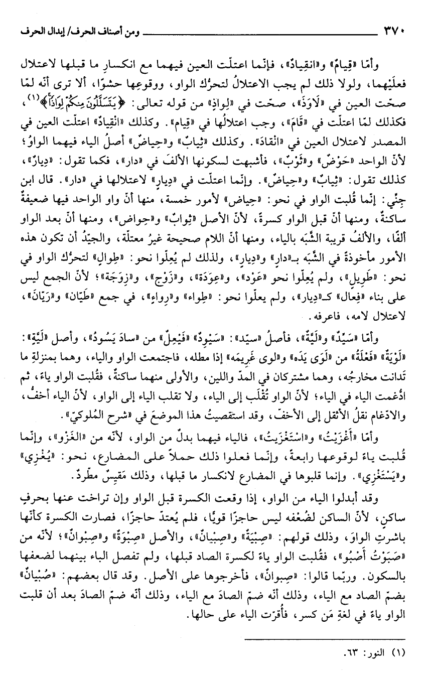 وأمّا "قِيامٌ" و"انقِيادٌ"، فإنّما اعتلّت العين فيهما مع انكسارِ ما قبلها لاعتلال فعلَيهما, ولولا ذلك لمِ يجب الاعتلالُ لتحرُّك الواو، ووقوعِها حشوًا، ألا ترى أنّه لمّا صحّت العين في "لَاوَذ"، صحّت في "لِواذٍ" من قوله تعالى: {يَتَسَلَّلُونَ مِنْكُمْ لِوَاذًا} (¬1)، فكذلك لمّا اعتلّت في "قَامَ"، وجب اعتلالُها في "قِيام". وكذلك "انْقِيادٌ" اعتلّت العين في المصدر لاعتلال العين في "انْقادَ". وكذلك "ثِيابٌ" و"حِياضٌ" أصلُ الياء فيهما الواوُ؛ لأنّ الواحد "حَوْضٌ" و"ثَوْبٌ"، فأشبهت لسكونها الألفَ في "دار"، فكما تقول: "دِيارٌ"، كذلك تقول: "ثِيابٌ" و"حِياضٌ". وإنّما اعتلّت في "دِيارٍ" لاعتلالها في "دار". قال ابن جِنِّي: إنما قُلبت الواو في نحو: "حِياض" لأمور خمسة، منها أنّ واو الواحد فيها ضعيفةٌ ساكنةٌ، ومنها أنّ قبل الواو كسرةً, لأنّ الأصل "ثِوابٌ" و"حِواض"، ومنها أنّ بعد الواو ألفًا، والألفُ قريبة الشَّبَه بالياء، ومنها أنّ اللام صحيحة غيرُ معتلّة، والجيّد أن تكون هذه الأمور مأخوذةً في الشَّبَه بـ "دارٍ" و"دِيارٍ", ولذلك لم يُعِلّوا نحو: "طِوالٍ" لتحرُّك الواو في نحو: "طَوِيلٍ"، ولم يُعِلّوا نحو "عَوْد"، و"عِوَدَة"، و"زَوْج"، و"زِوَجَة"؛ لأنّ الجمع ليس علي بناء "فِعال" كـ "دِيار", ولم يعلّوا نحو: "طِواء" و"رِواءٍ"، في جمع "طَيّان" و"رَيّانَ"، لاعتلال لامه، فاعرفه.
