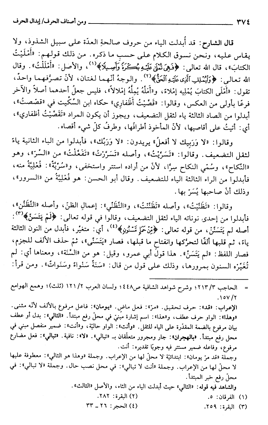 قال الشارح: قد أُبدلت الياء من حروف صالحةِ العدة على سبيل الشذوذ، ولا يقاس عليه، ونحن نسوق الكلام على حسب ما ذكره. من ذلك قولهم: "أَمْلَيْتُ الكتابَ"، قال الله تعالى: {فَهِيَ تُمْلَى عَلَيْهِ بُكْرَةً وَأَصِيلًا} (¬1)، والأصل: "أَمْلَلتُ". وقال الله تعالى: {وَلْيُمْلِلِ الَّذِي عَلَيْهِ الْحَقُّ} (¬2). والوجهُ أنّهما لغتان, لأنّ تصرُّفهما واحدٌ، تقول: "أَمْلَى الكتابَ يُمْلِيه إمْلاءً، و"أمَلَّهُ يُمِلُّهُ إمْلالًا"، فليس جعلُ أحدهما أصلاً والآخر فرعًا بأولى من العكس، وقالوا: "قَضيتُ أَطفارِي" حكاه ابن السِّكيت في "قصّصتُ"، أبدلوا من الصاد الثالثة ياء لثقل التضعيف، ويجوز أن يكون المراد "تَقَصَّيْتُ أظفاري" , أي: أتيتُ على أقاصيها, لأنّ المأخوذ أطرافها، وطرفُ كلّ شيء أقصاه.